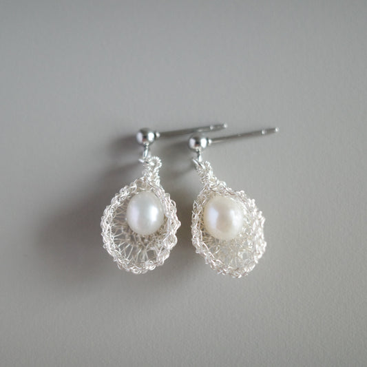 雫(しずく) パール – ワイヤークロッシェ 耳飾り シルバー