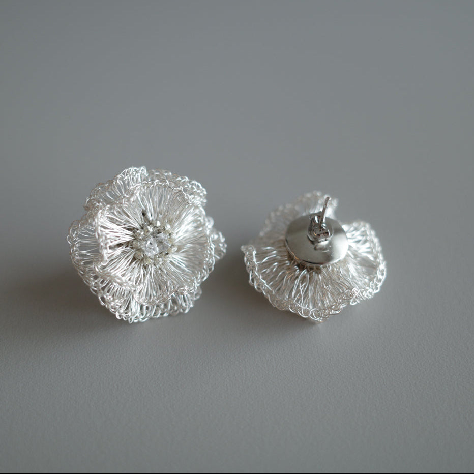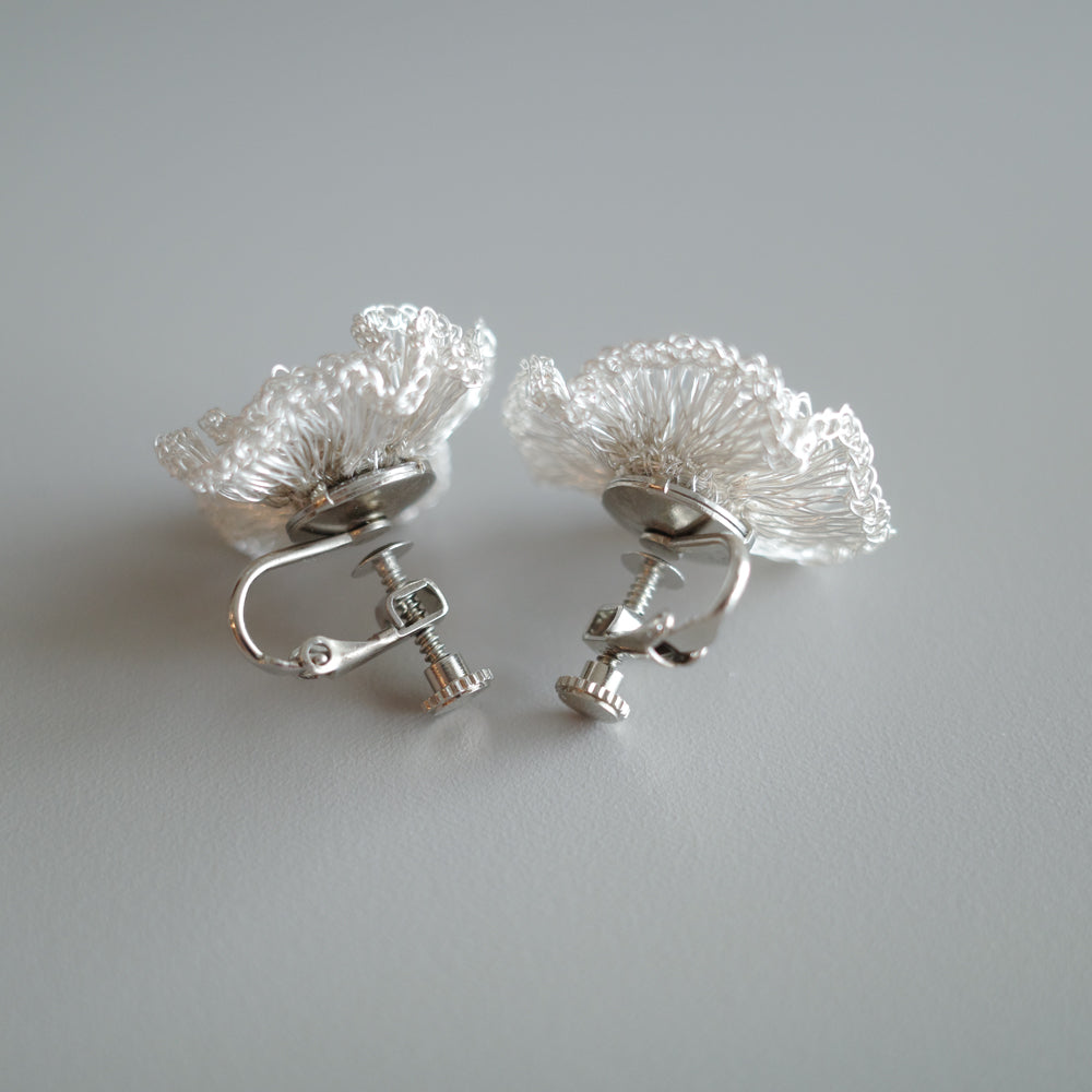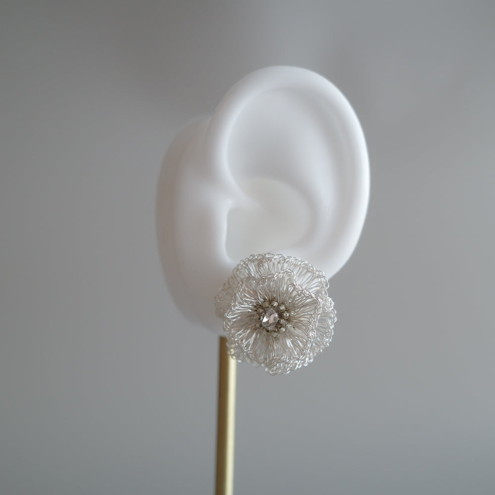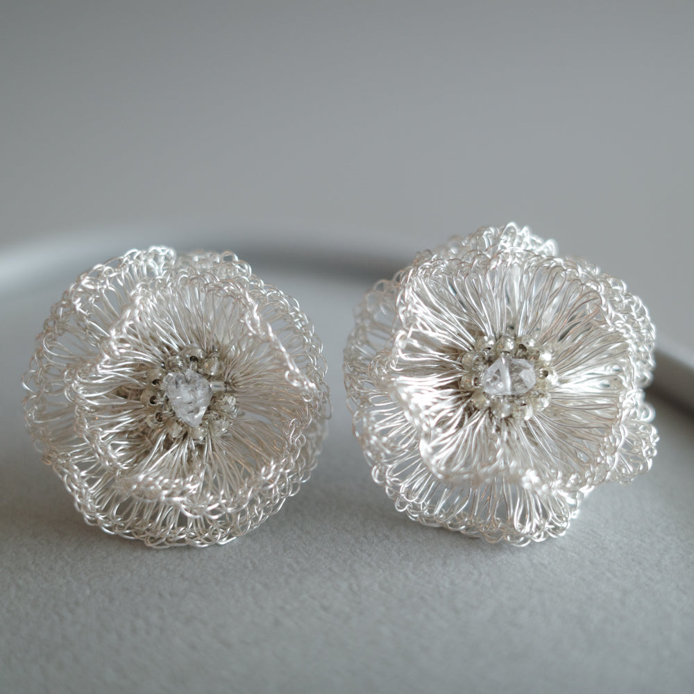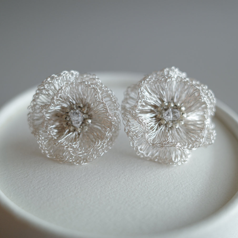 花びらのように繊細に編み上げたワイヤーレースを二重に重ね、立体感のあるデザインに仕立てた耳飾りです。