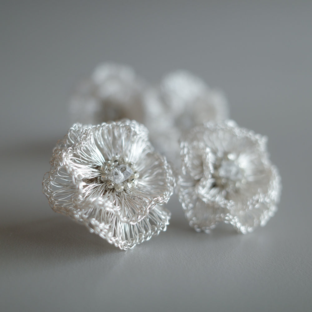 [ ワイヤークロッシェについて ] 金属ワイヤーをかぎ針で一目ずつ編み上げる繊細な技法です。すべて手作業のため軽やかで、長時間の着用も快適。日常使いから特別な日まで幅広くお楽しみいただけます。