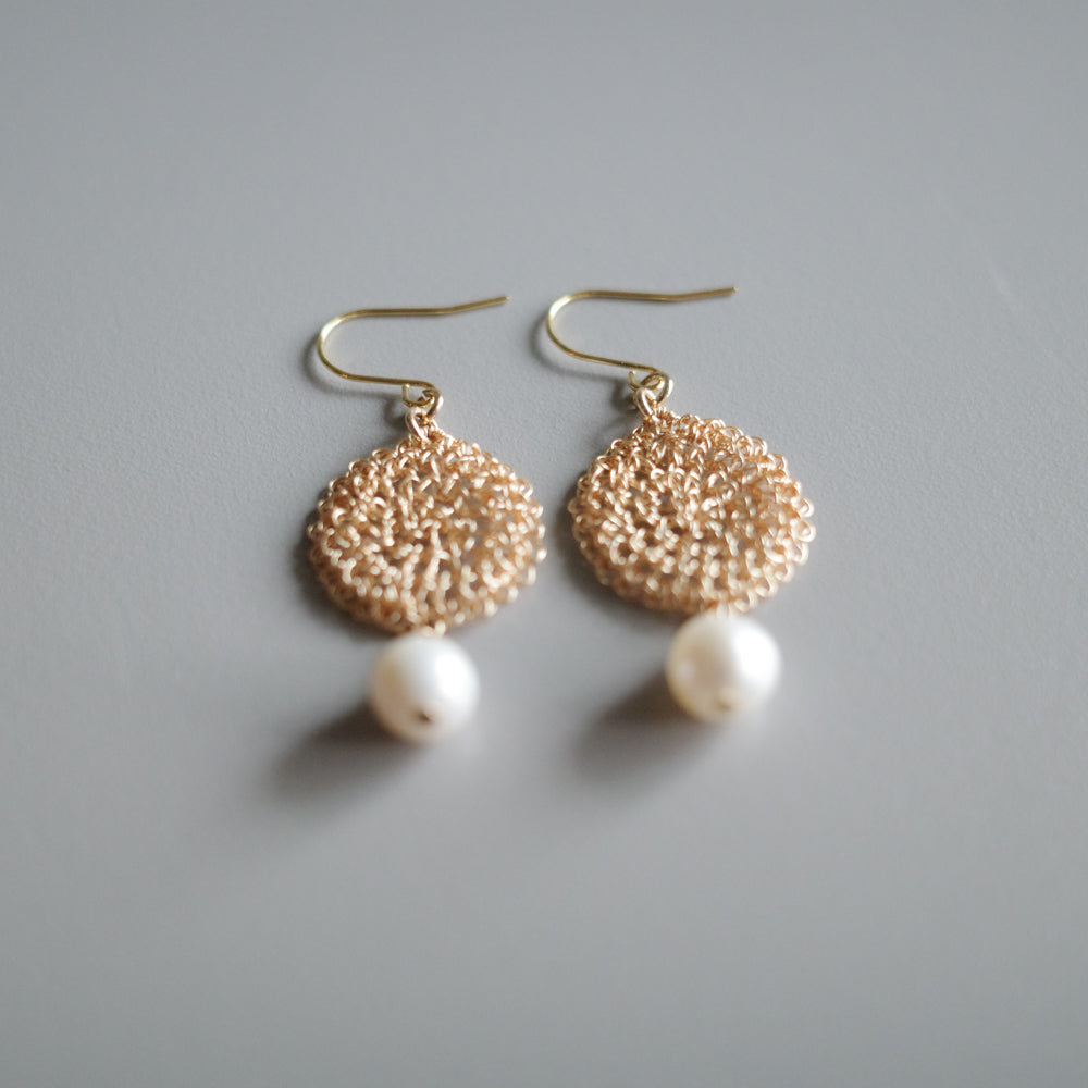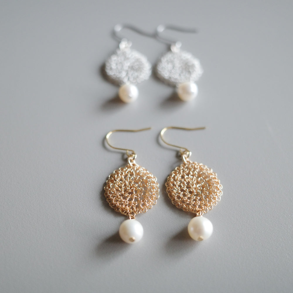 繊細なワイヤーを一針ずつ編み上げて生まれた、透かし模様のような丸いモチーフに、上質な淡水パールをあしらった耳飾り。