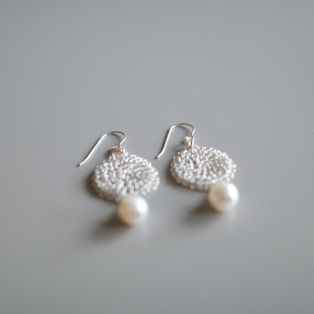 繊細なワイヤーを一針ずつ編み上げて生まれた、透かし模様のような丸いモチーフに、上質な淡水パールをあしらった耳飾り。