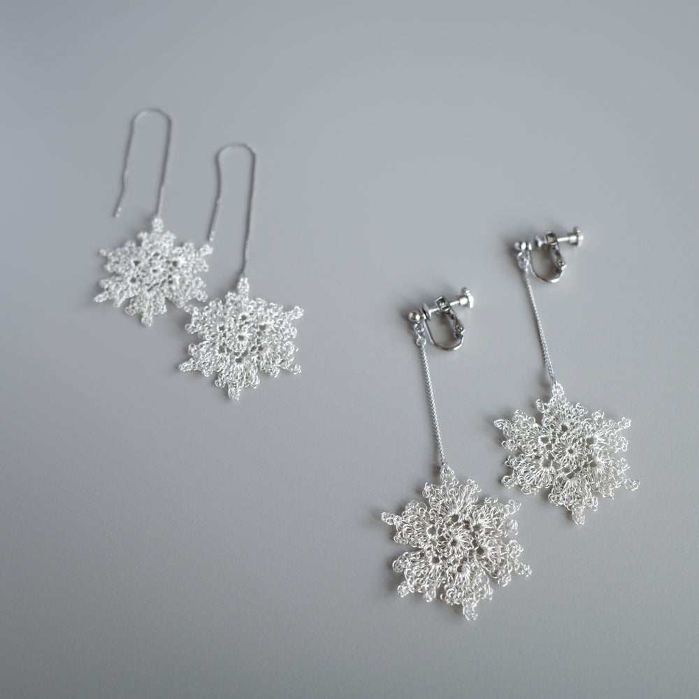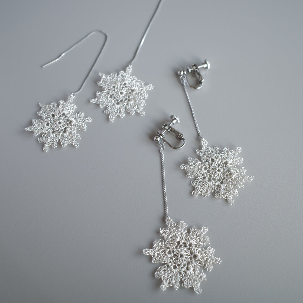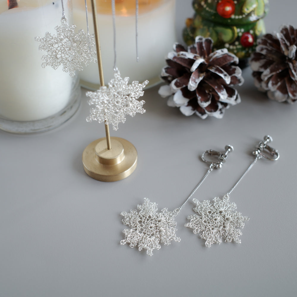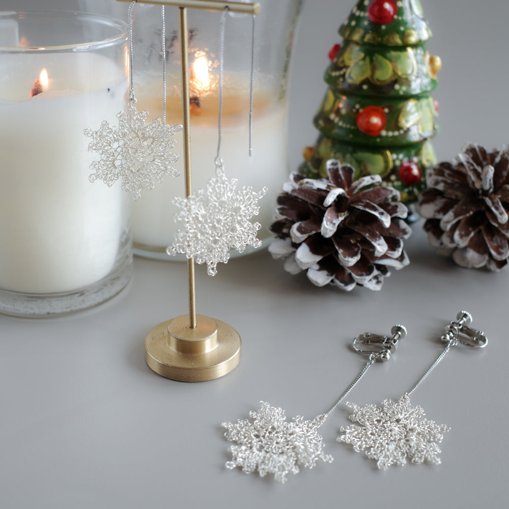 極細ワイヤーを丁寧に編み上げた雪の結晶モチーフが、耳元にやわらかな輝きを添えます。透け感のある編み地は驚くほど軽やか。長時間の装着でも負担になりにくく、日常から特別なシーンまで上品に寄り添います。