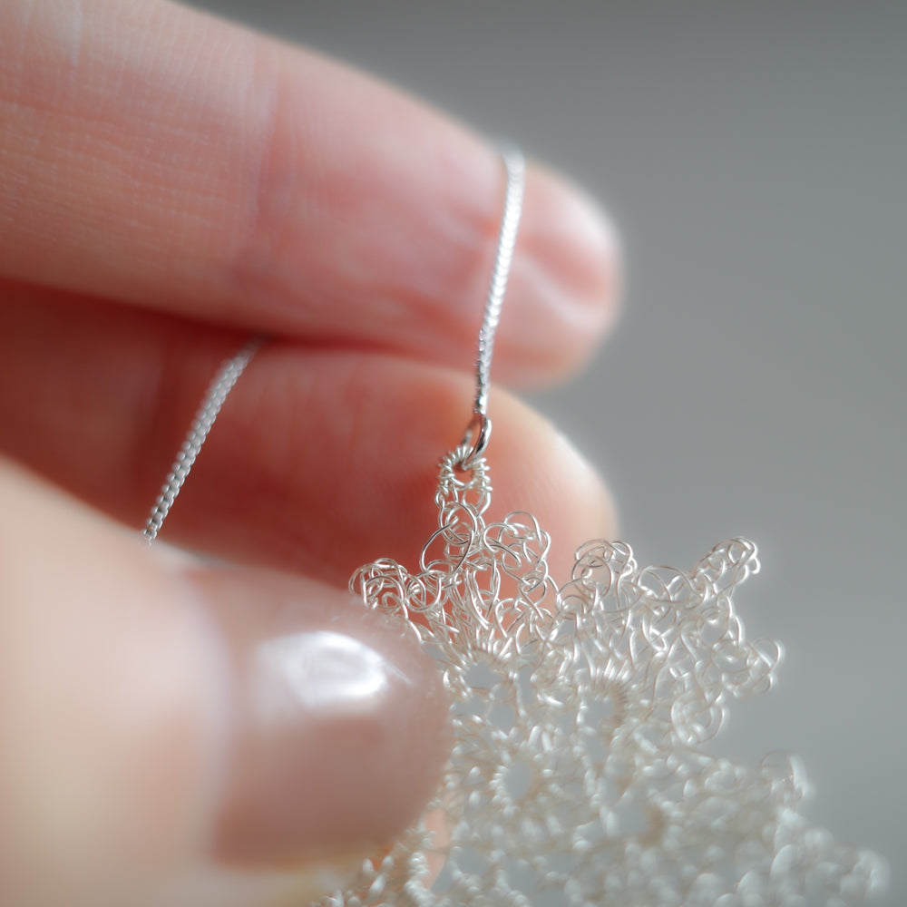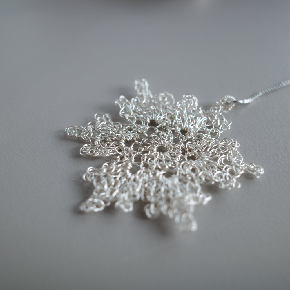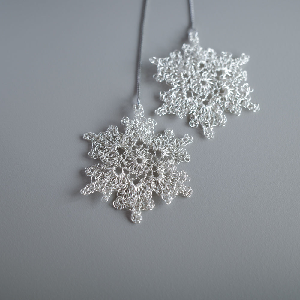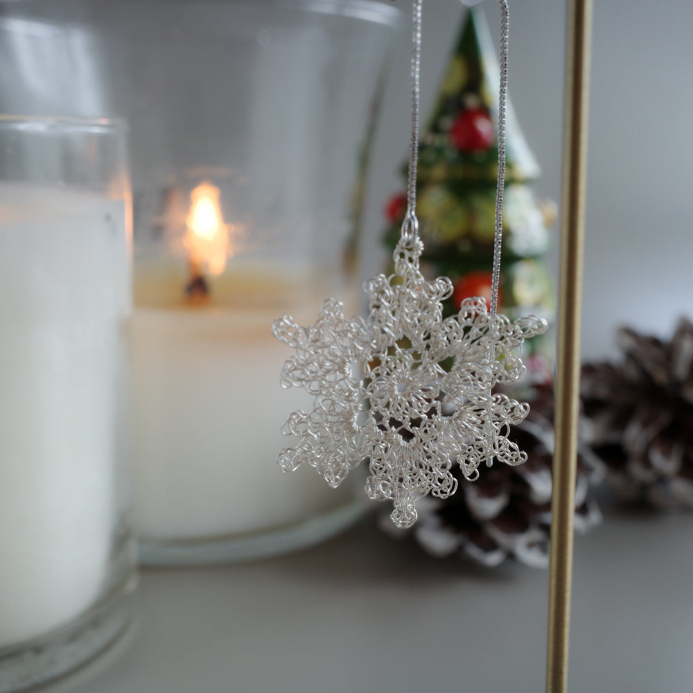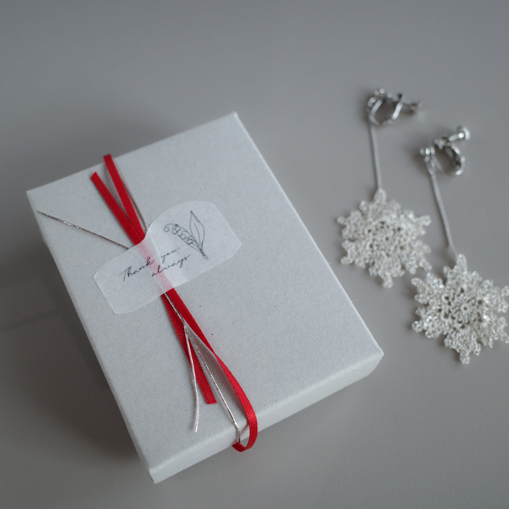 極細ワイヤーを丁寧に編み上げた雪の結晶モチーフが、耳元にやわらかな輝きを添えます。透け感のある編み地は驚くほど軽やか。長時間の装着でも負担になりにくく、日常から特別なシーンまで上品に寄り添います。