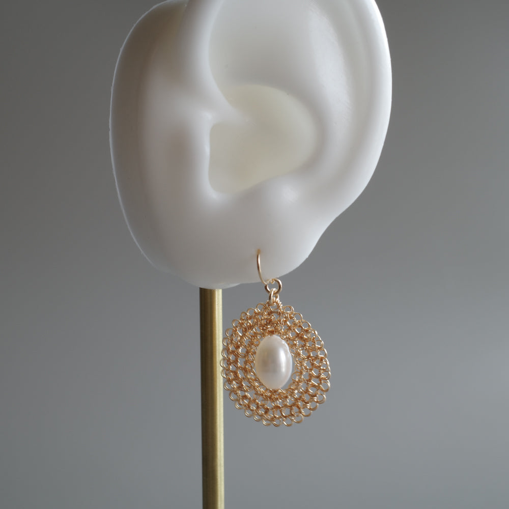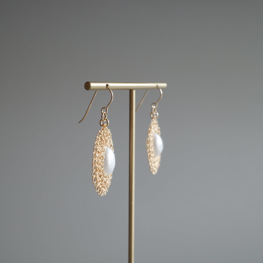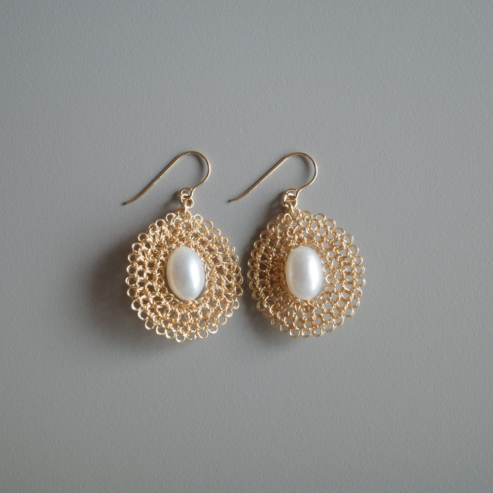 雫(しずく) パール – ワイヤークロッシェ 耳飾り ゴールド