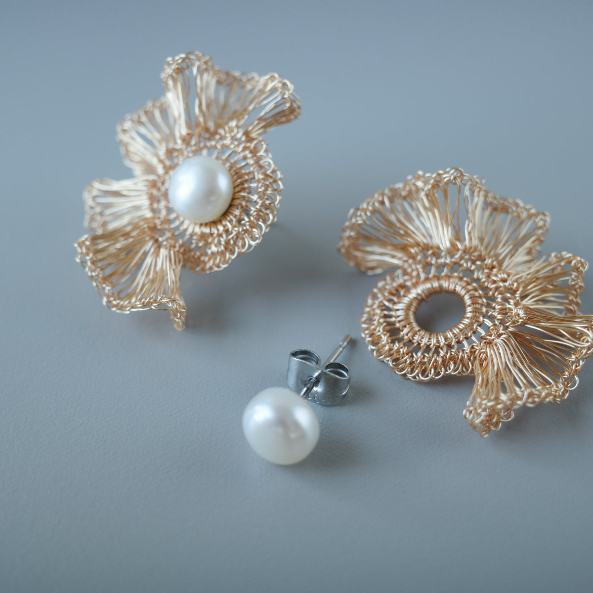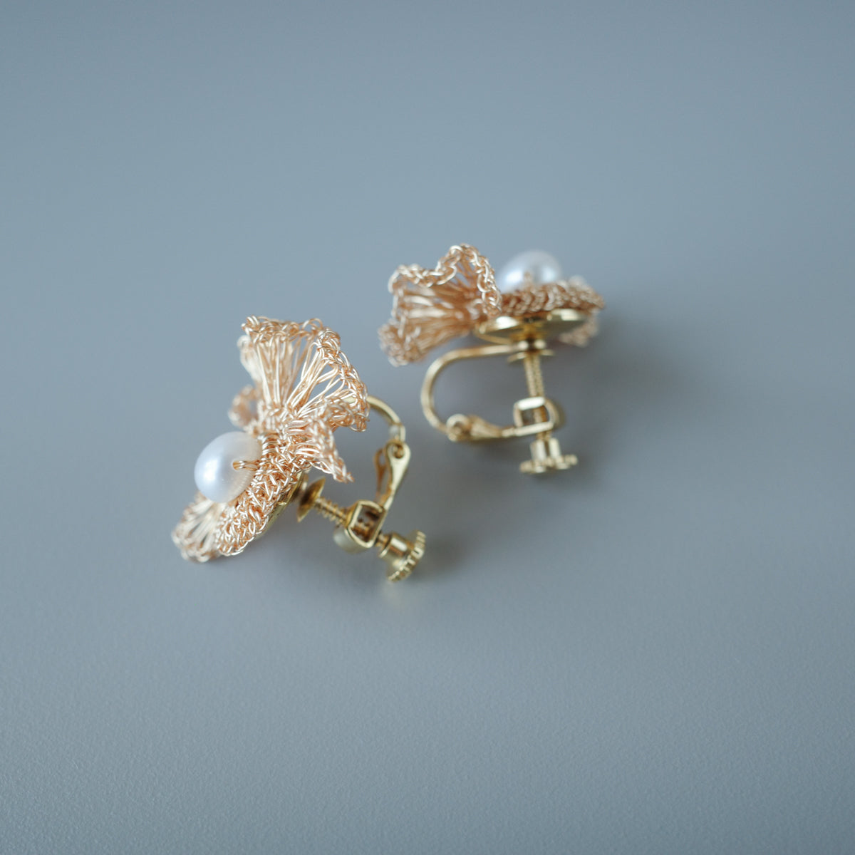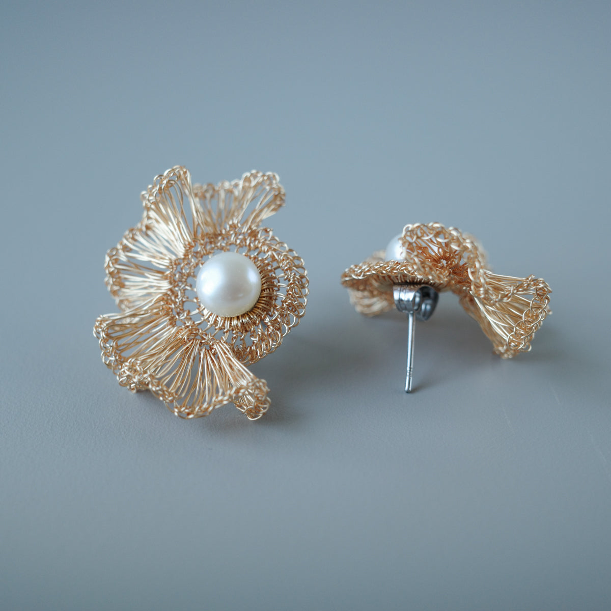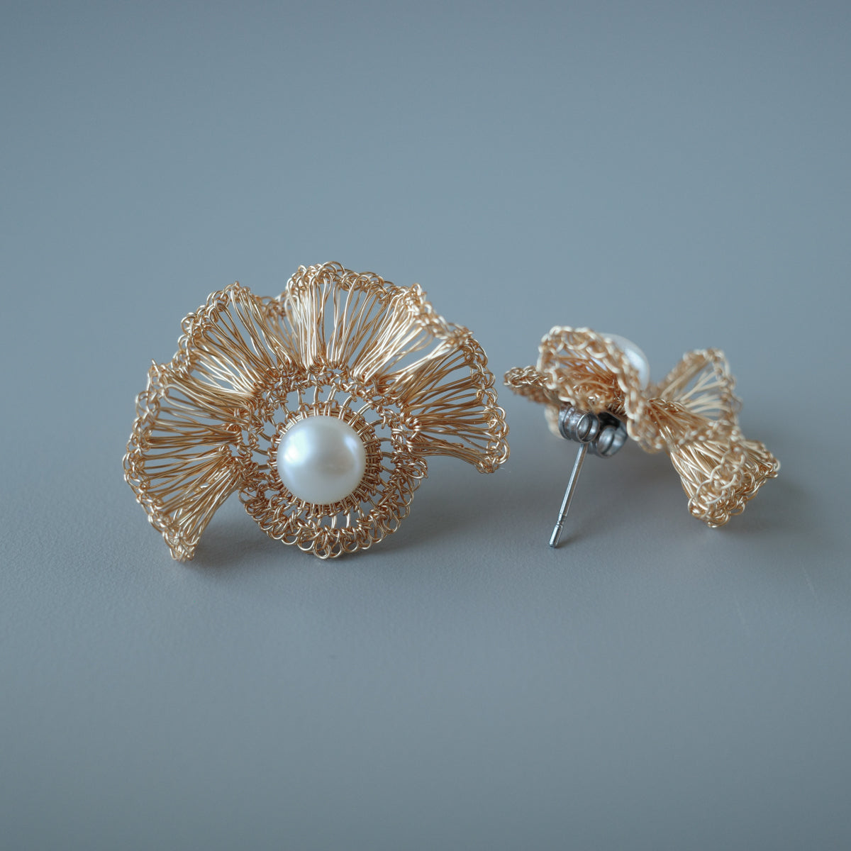 [ ワイヤークロッシェについて ] 金属ワイヤーをかぎ針で一目ずつ編み上げる繊細な技法です。すべて手作業のため軽やかで、長時間の着用も快適。日常使いから特別な日まで幅広くお楽しみいただけます。