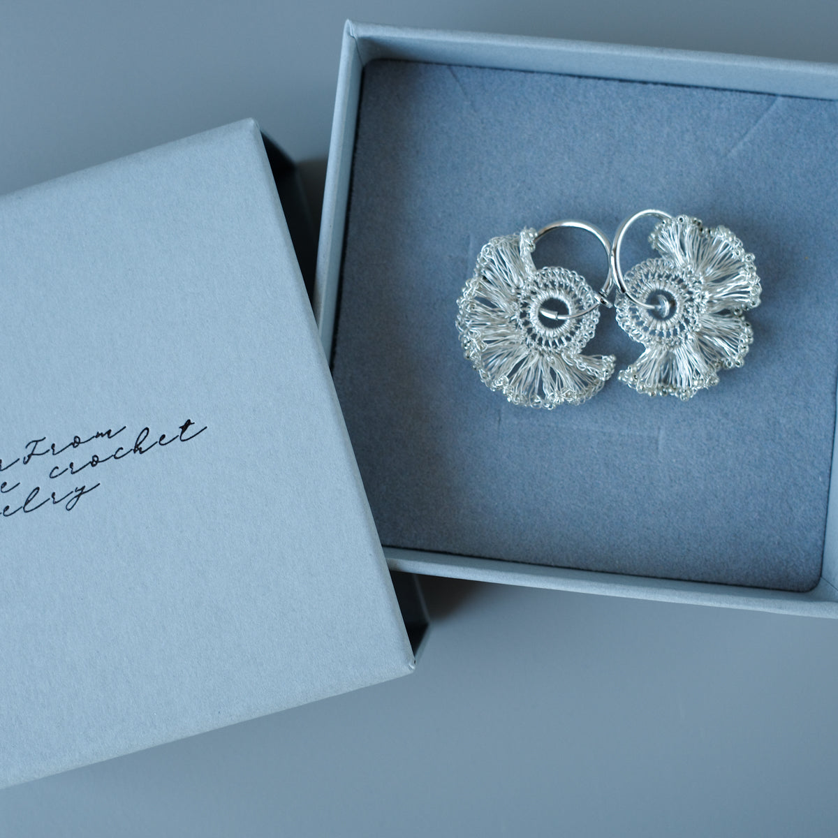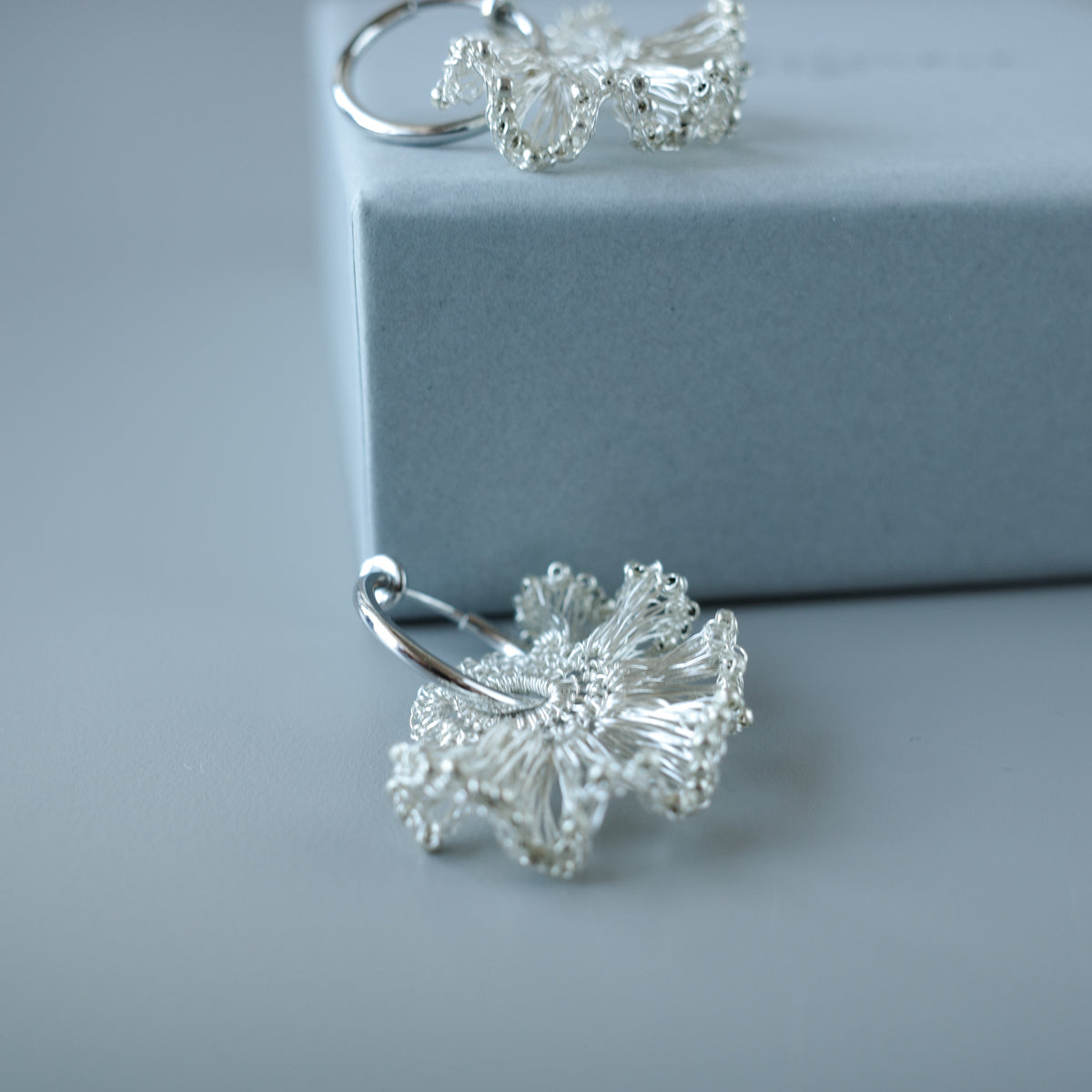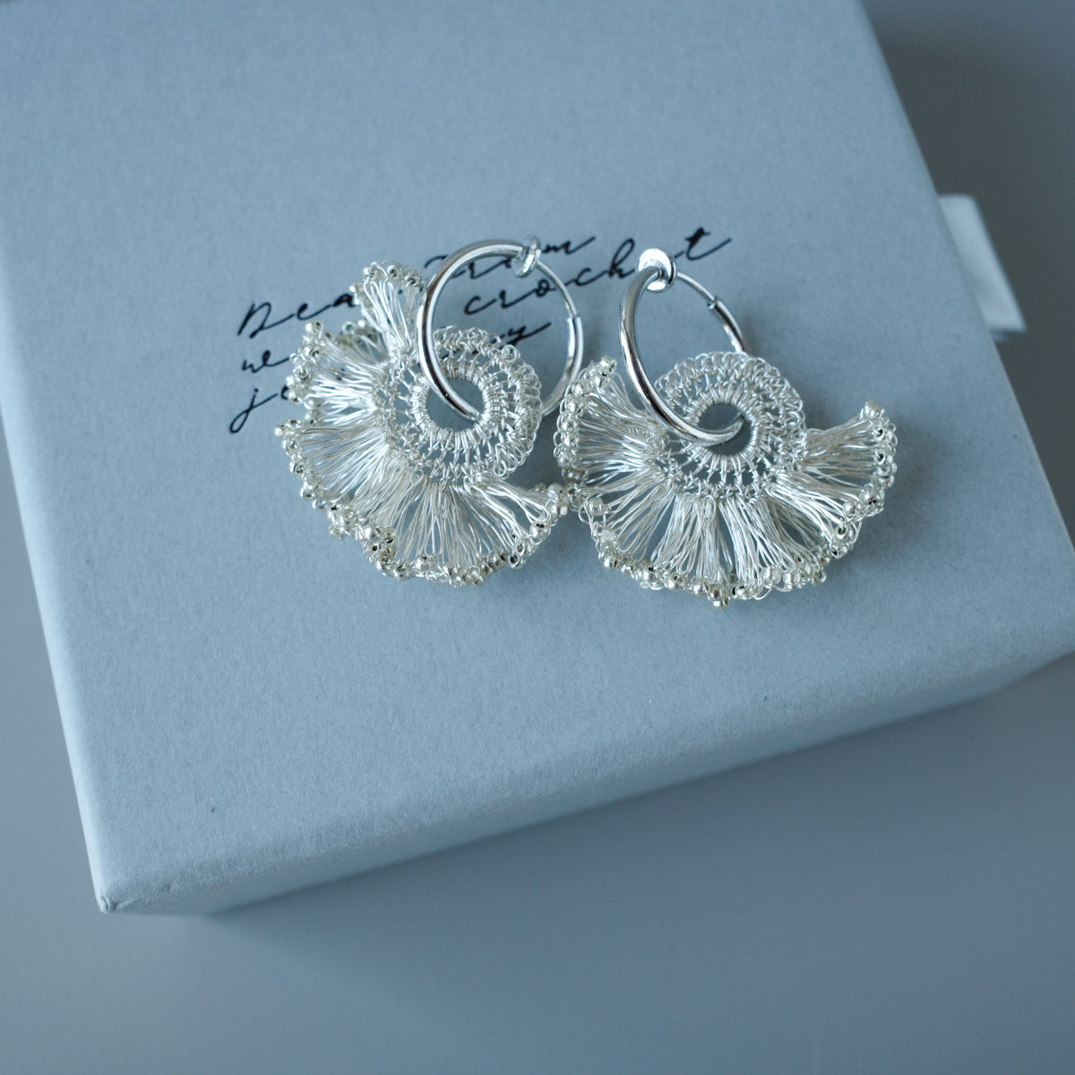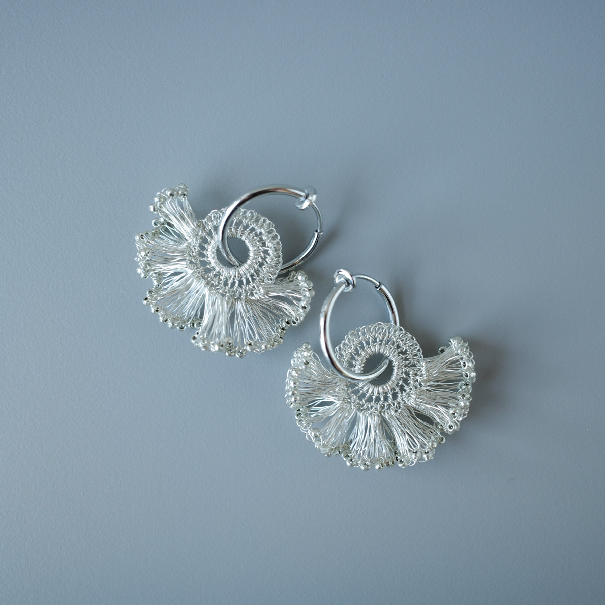 [ ワイヤークロッシェについて ] 金属ワイヤーをかぎ針で一目ずつ編み上げる繊細な技法です。すべて手作業のため軽やかで、長時間の着用も快適。日常使いから特別な日まで幅広くお楽しみいただけます。