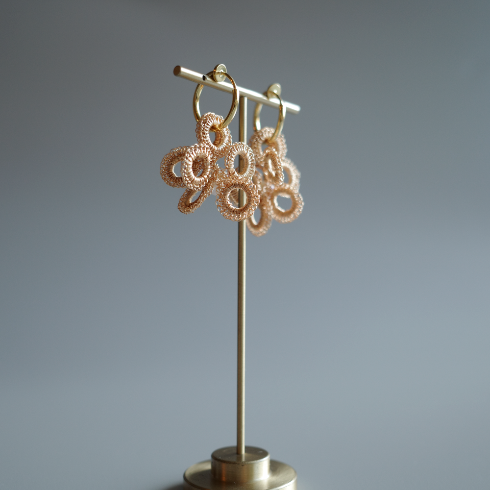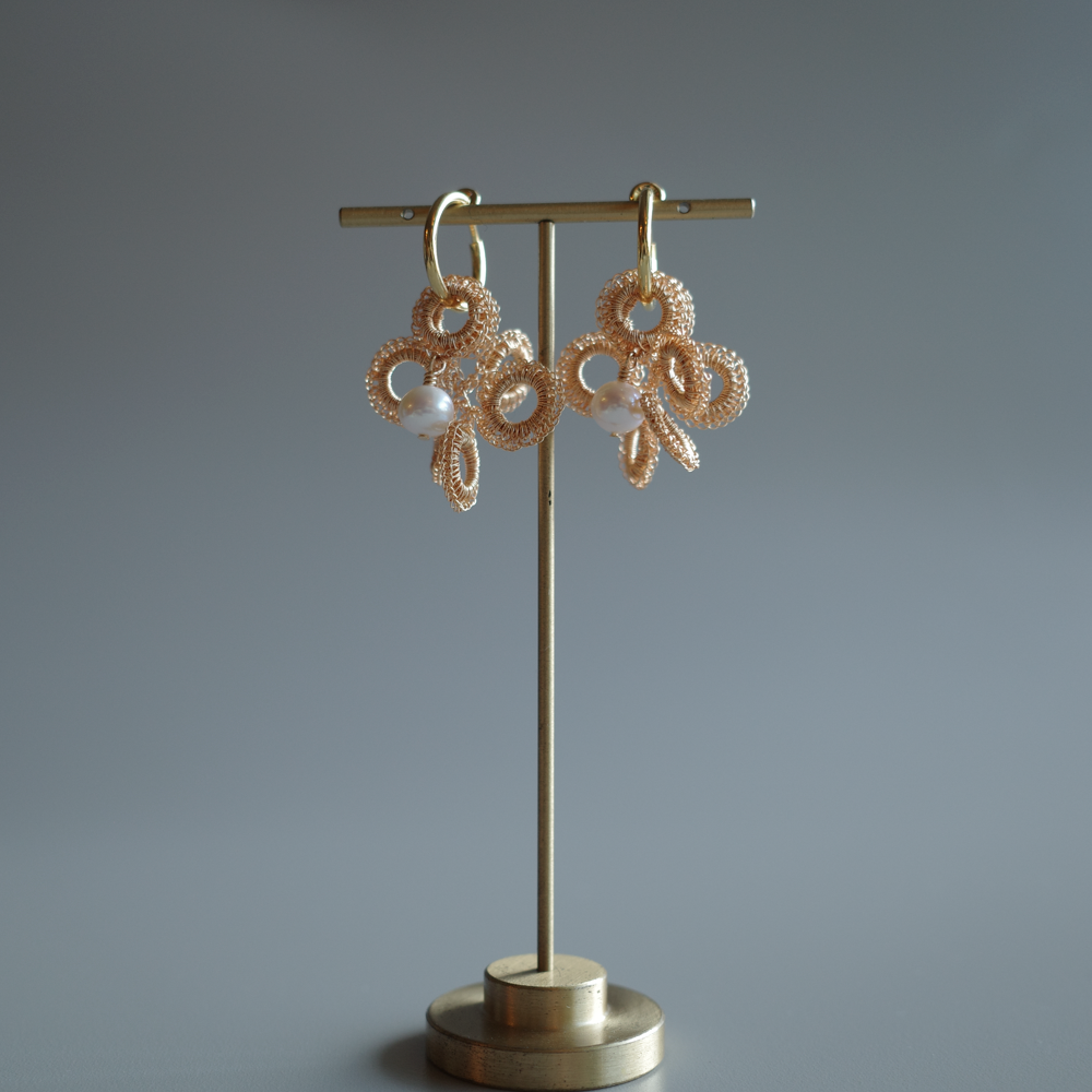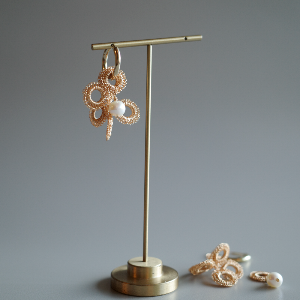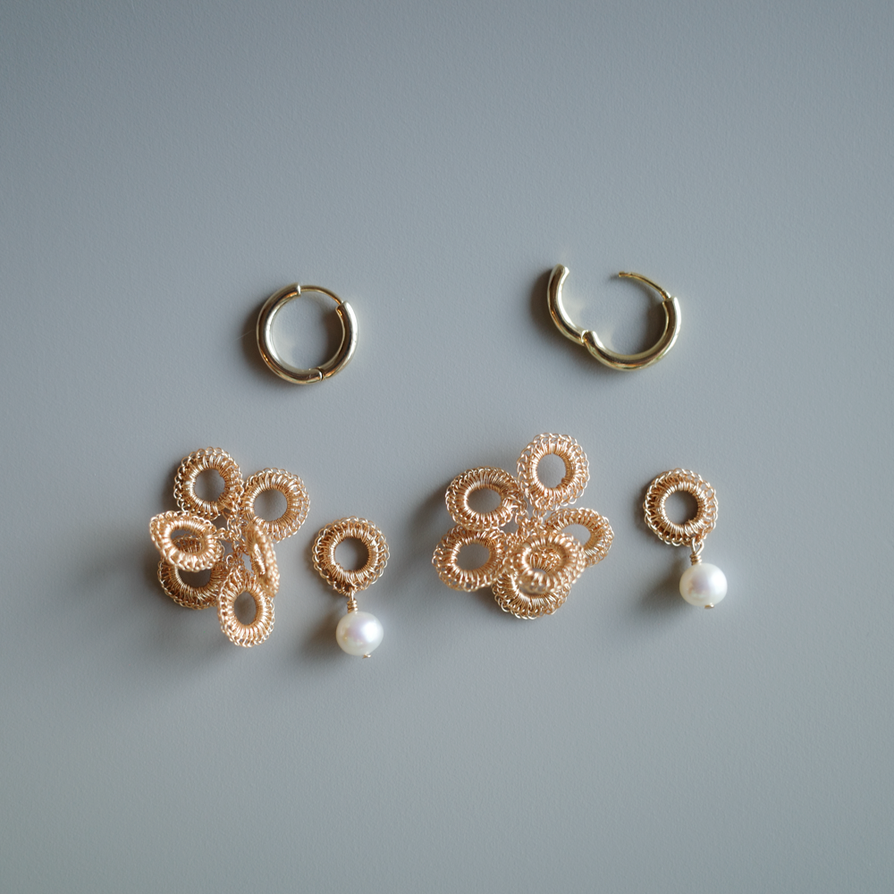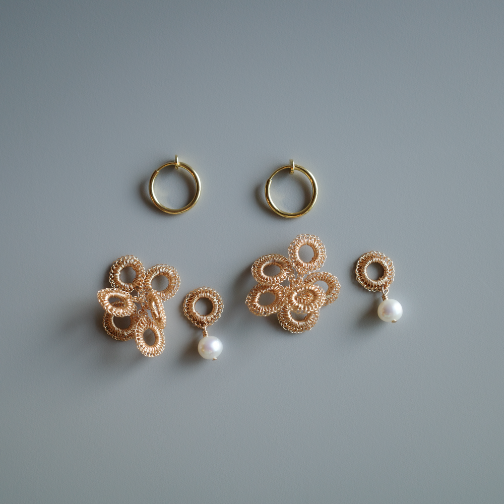 [ ワイヤークロッシェについて ] 金属ワイヤーをかぎ針で一目ずつ編み上げる繊細な技法です。すべて手作業のため軽やかで、長時間の着用も快適。日常使いから特別な日まで幅広くお楽しみいただけます。