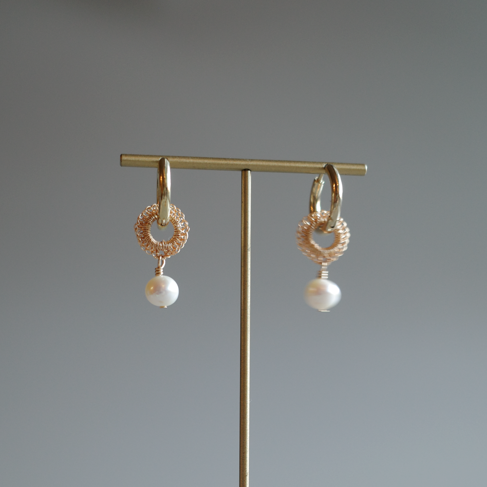 大きさとデザインが異なる SS・パール◯ の2種類のモチーフを、 極細ワイヤーで一つひとつ丁寧に手編みしました。 同じカラーで揃えた4点セットです。