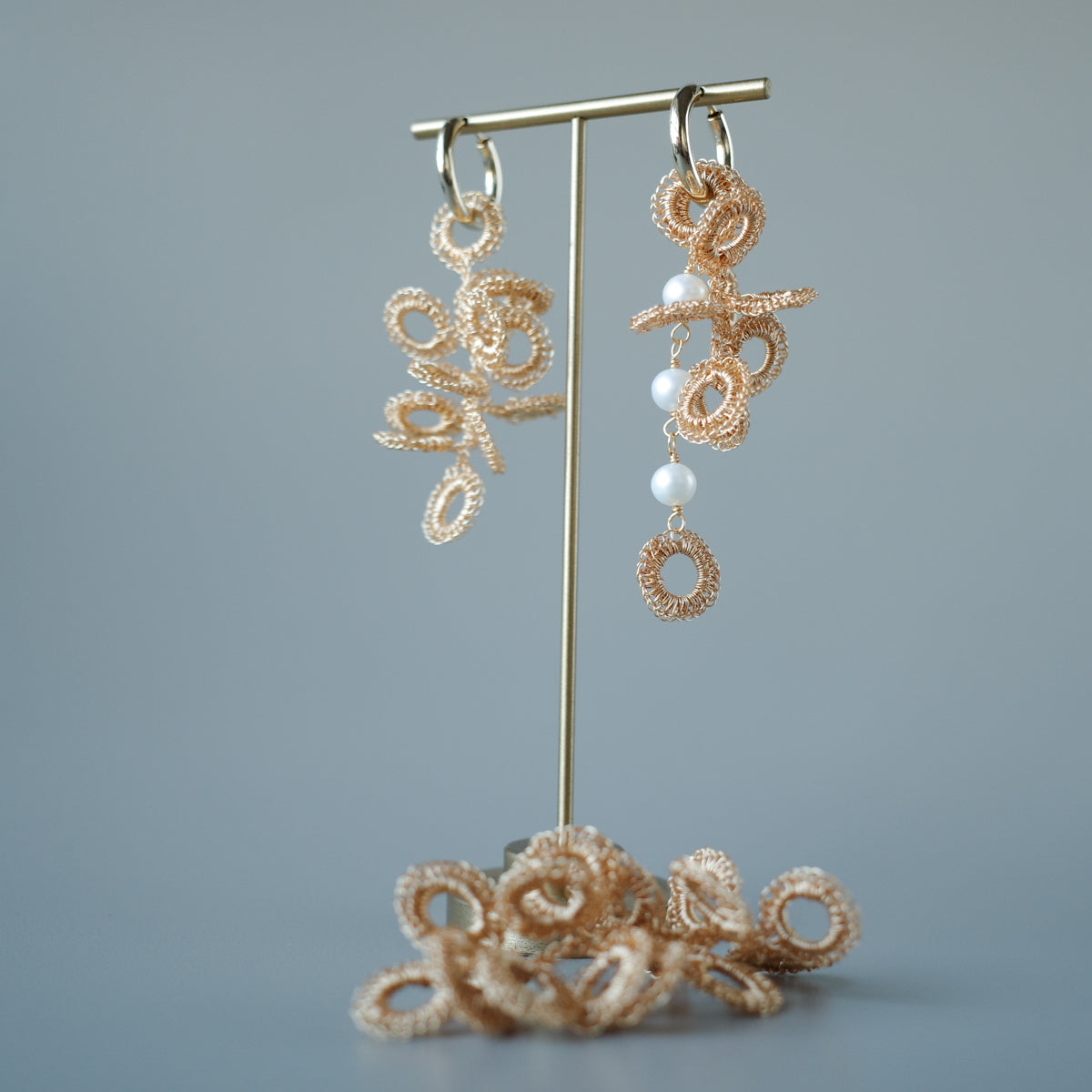 大きさとデザインが異なる S・M・L・パール の4種類のモチーフを、極細ワイヤーで一つひとつ丁寧に手編みしました。同じ色で揃えたセットだから、届いてすぐに上品なコーディネートが完成します。