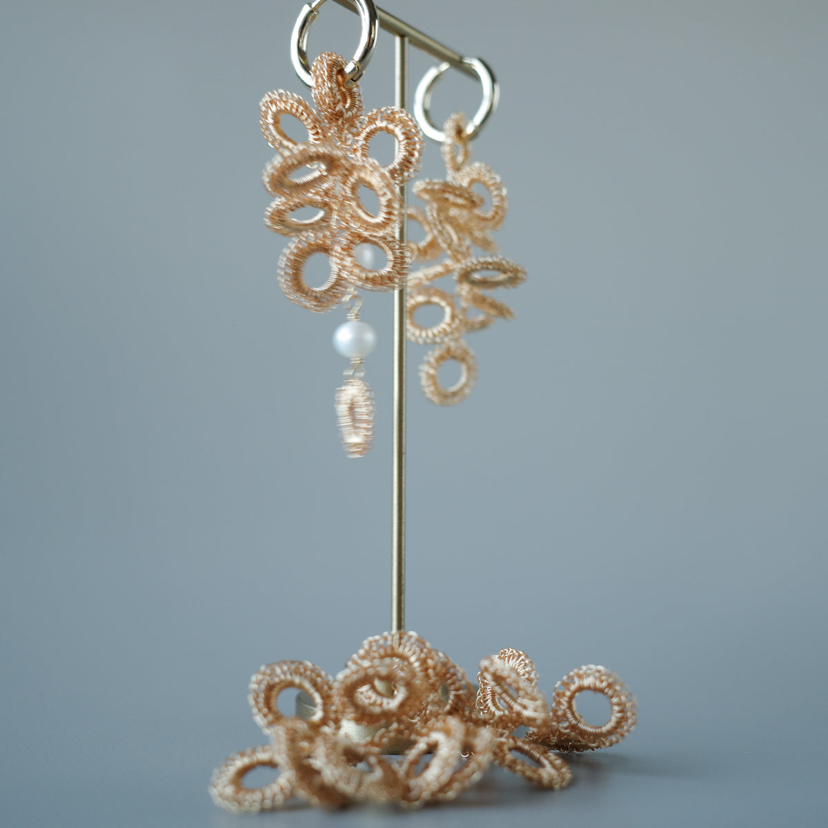 [ ワイヤークロッシェについて ] 金属ワイヤーをかぎ針で一目ずつ編み上げる繊細な技法です。すべて手作業のため軽やかで、長時間の着用も快適。日常使いから特別な日まで幅広くお楽しみいただけます。