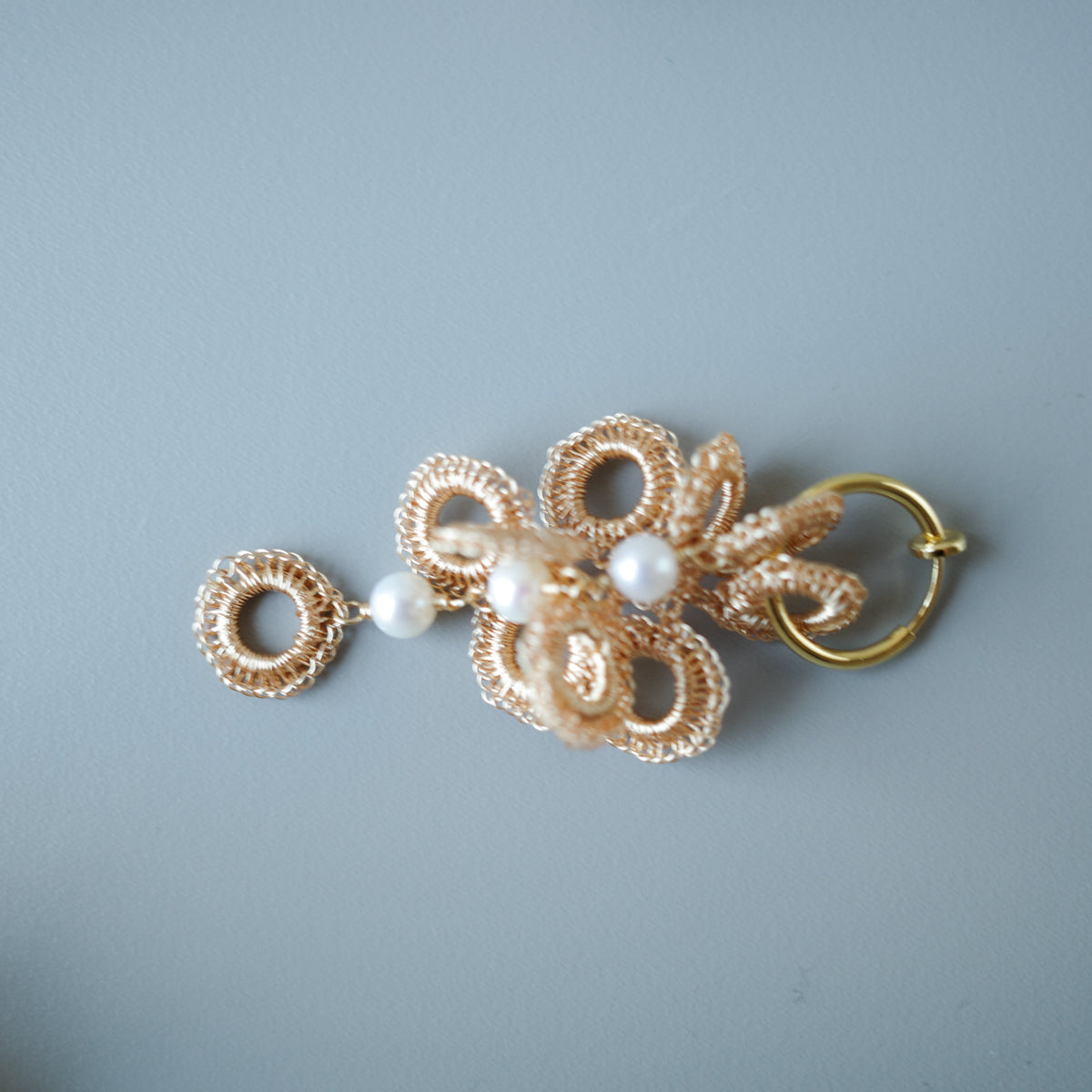 [ ワイヤークロッシェについて ] 金属ワイヤーをかぎ針で一目ずつ編み上げる繊細な技法です。すべて手作業のため軽やかで、長時間の着用も快適。日常使いから特別な日まで幅広くお楽しみいただけます。