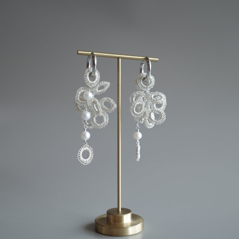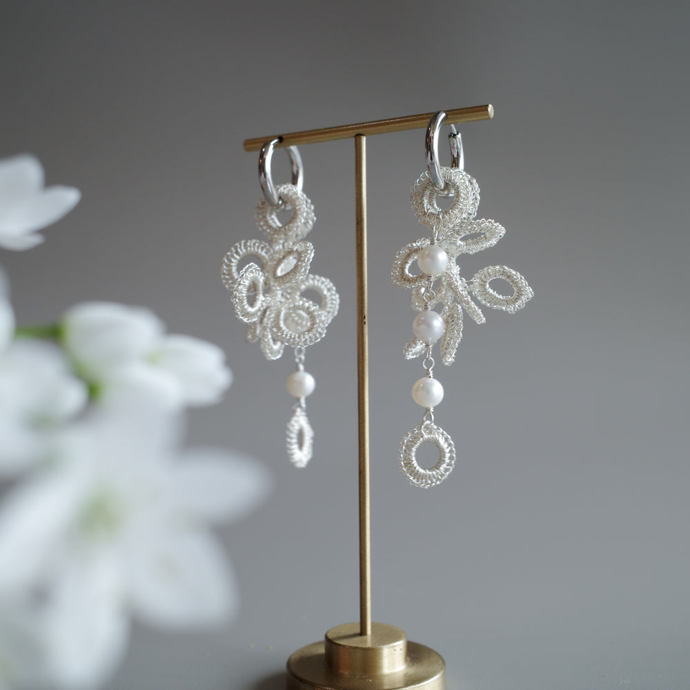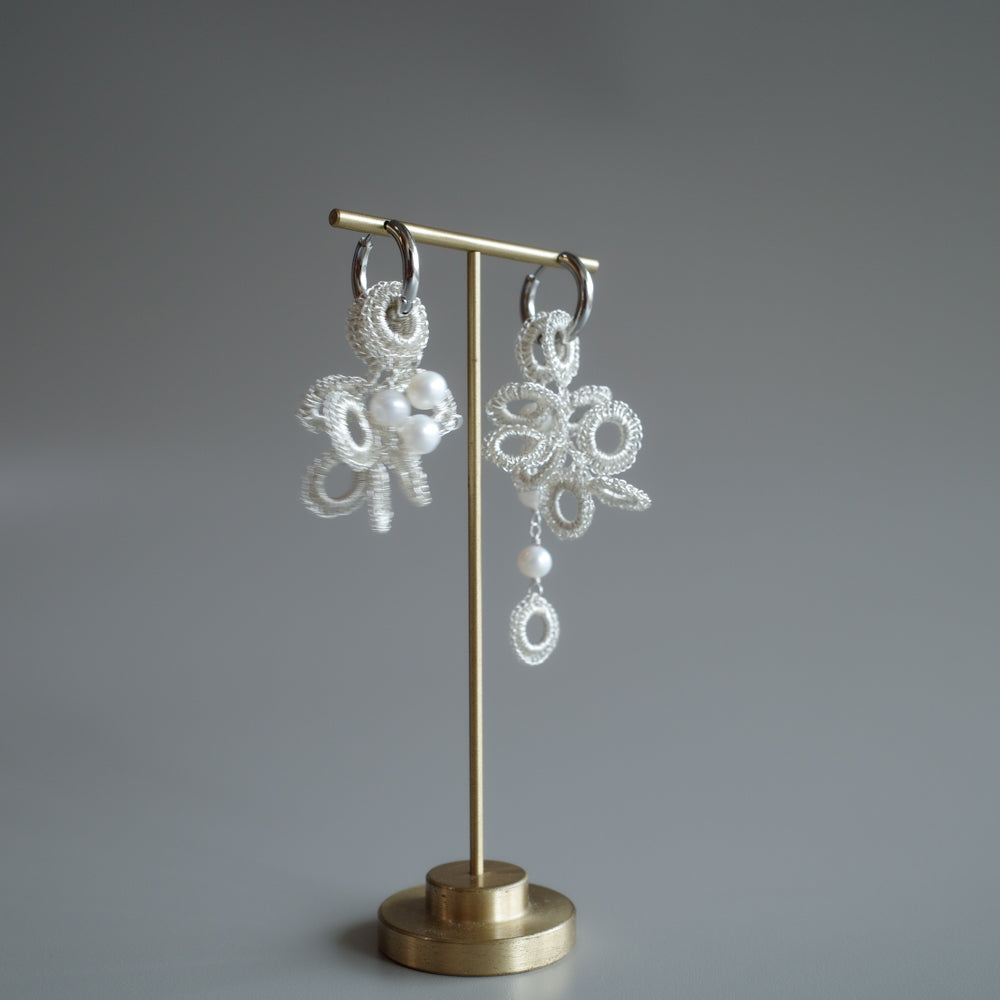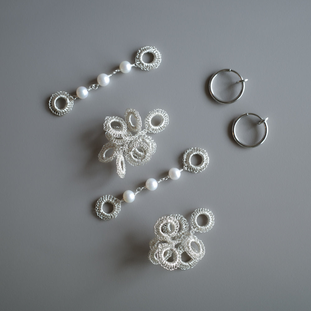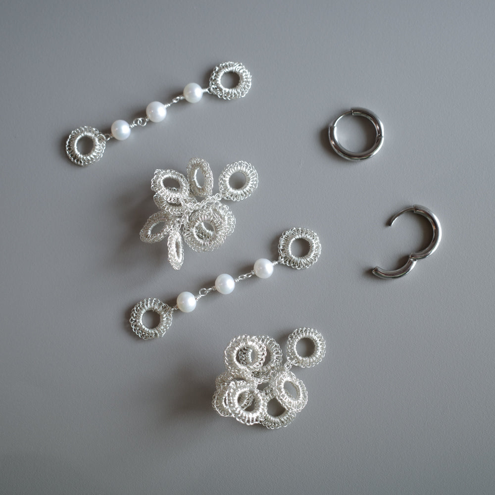 大きさとデザインが異なる S・ パール の2種類のモチーフを、極細ワイヤーで一つひとつ丁寧に手編みしました。同じ色で揃えたセットだから、届いてすぐに上品なコーディネートが完成します。