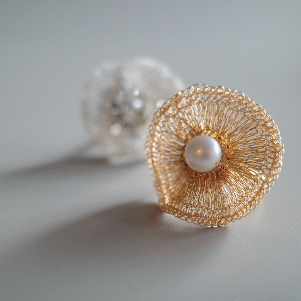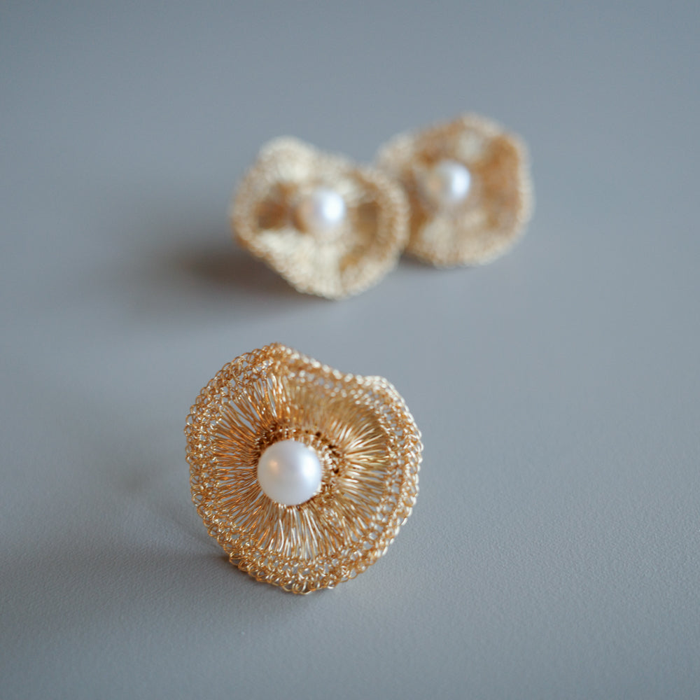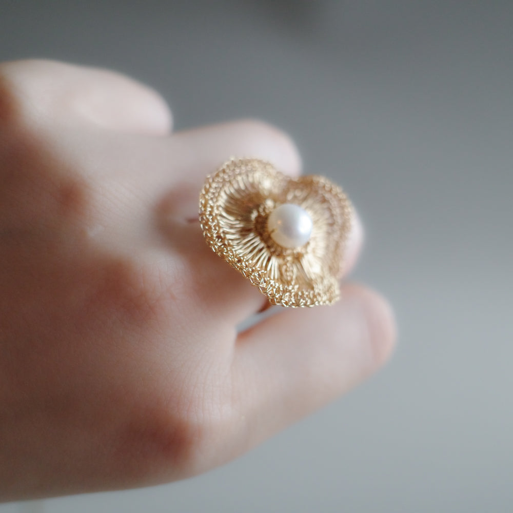 繊細に編み込まれたワイヤークロッシェに、淡水パールを一粒あしらったリング。