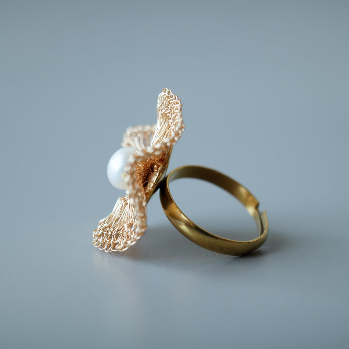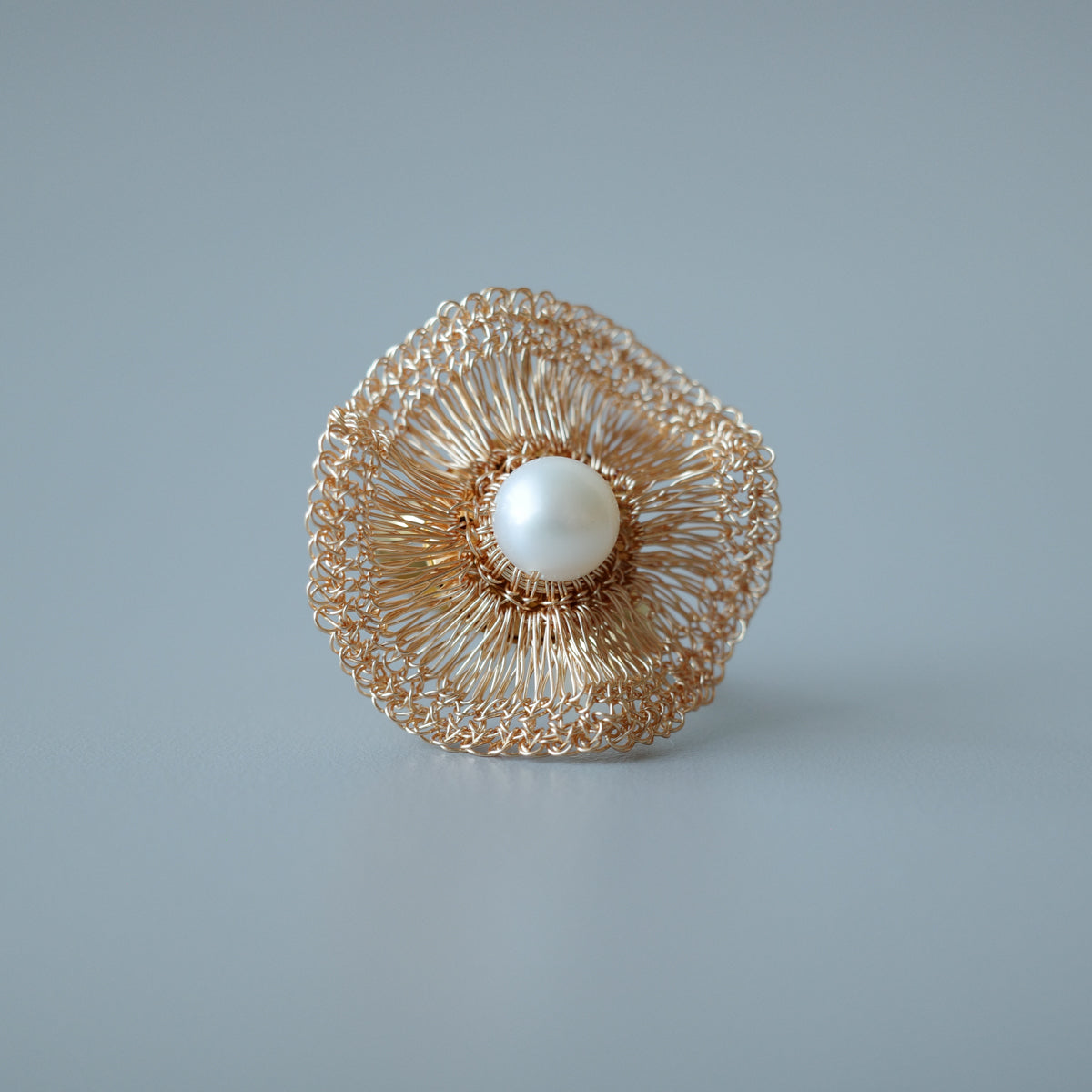 繊細に編み込まれたワイヤークロッシェに、淡水パールを一粒あしらったリング。