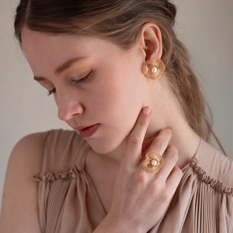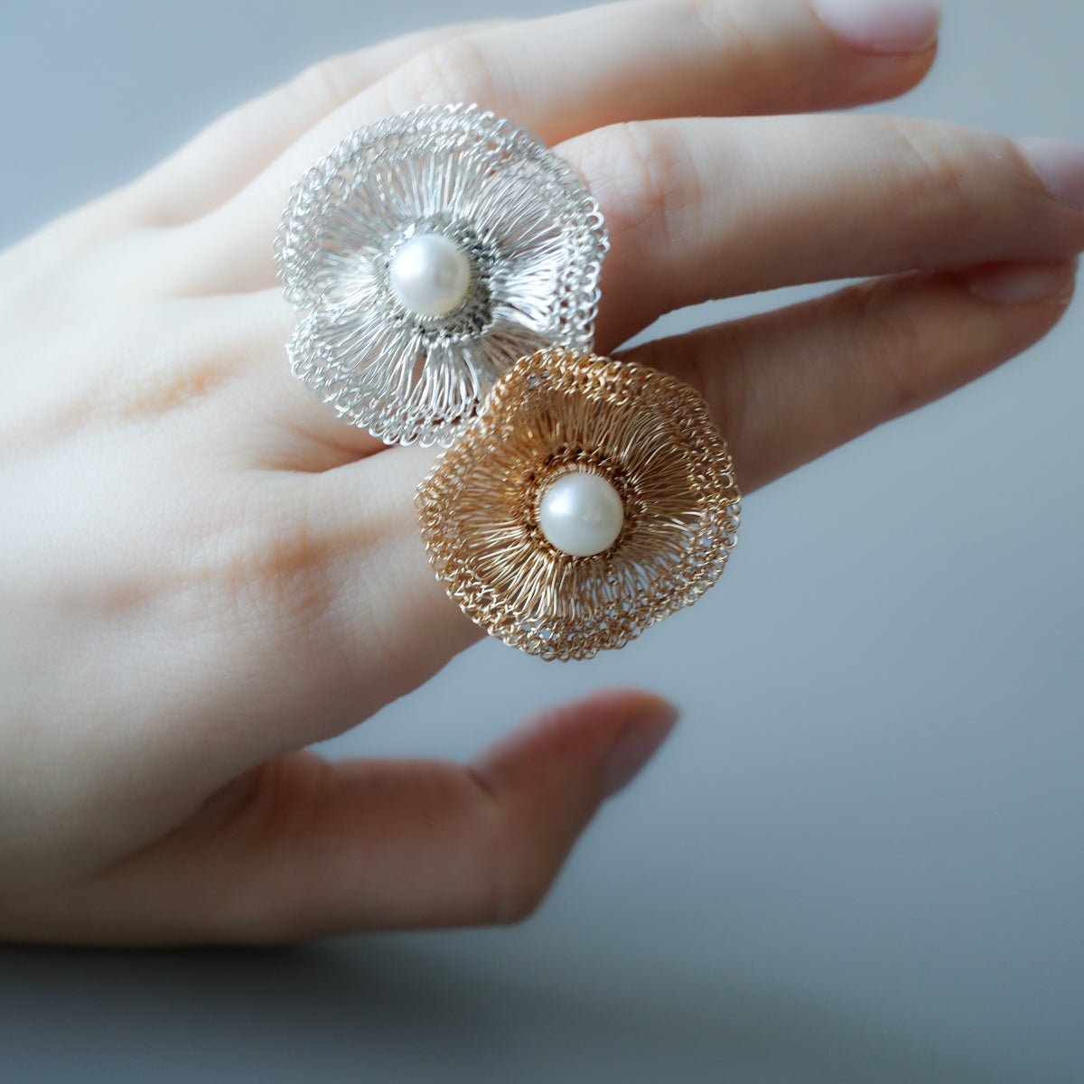 繊細に編み込まれたワイヤークロッシェに、淡水パールを一粒あしらったリング。