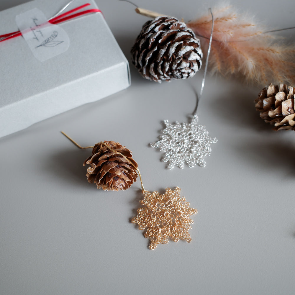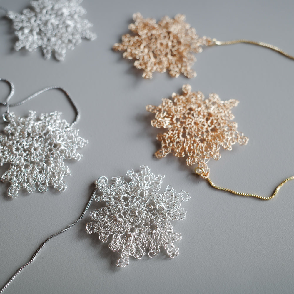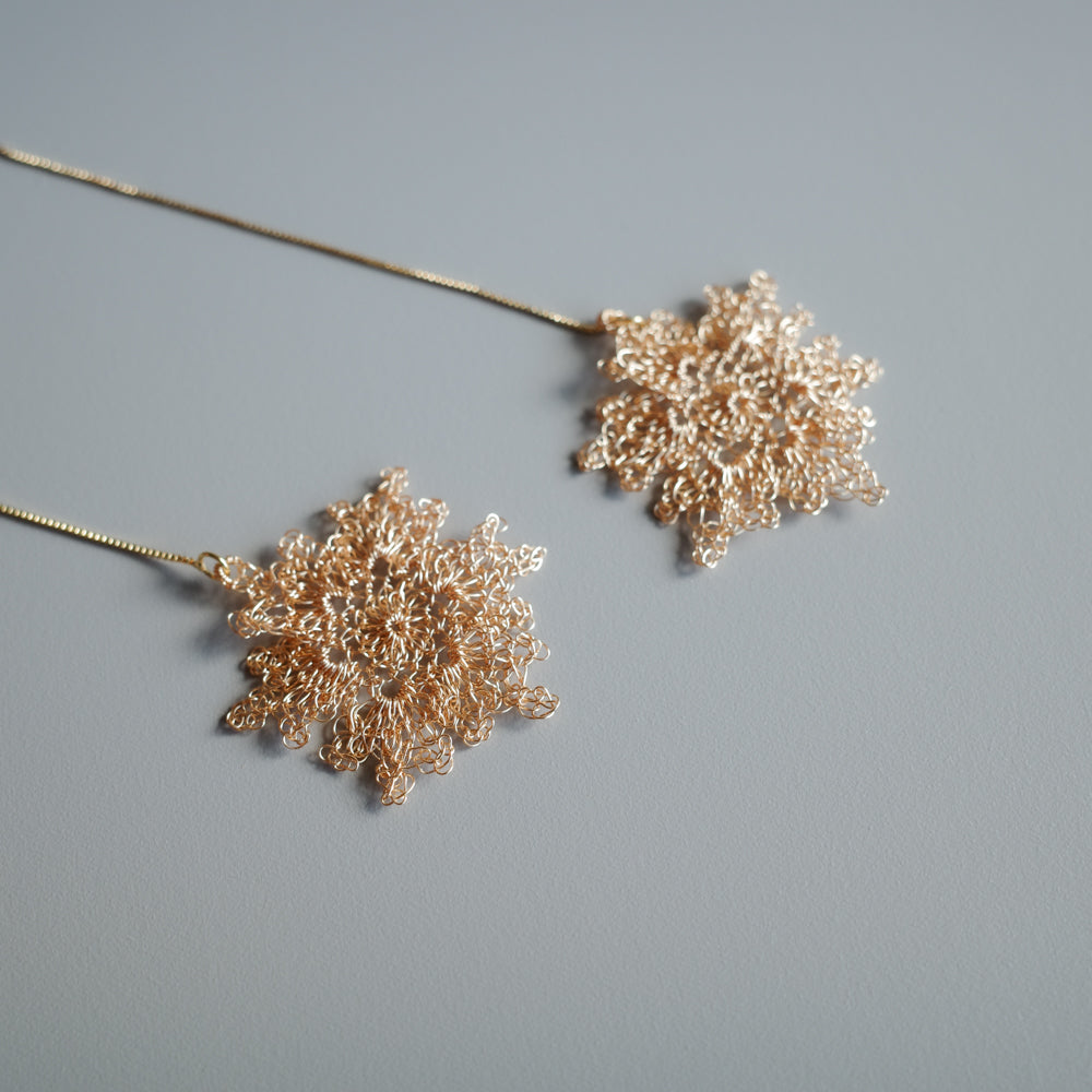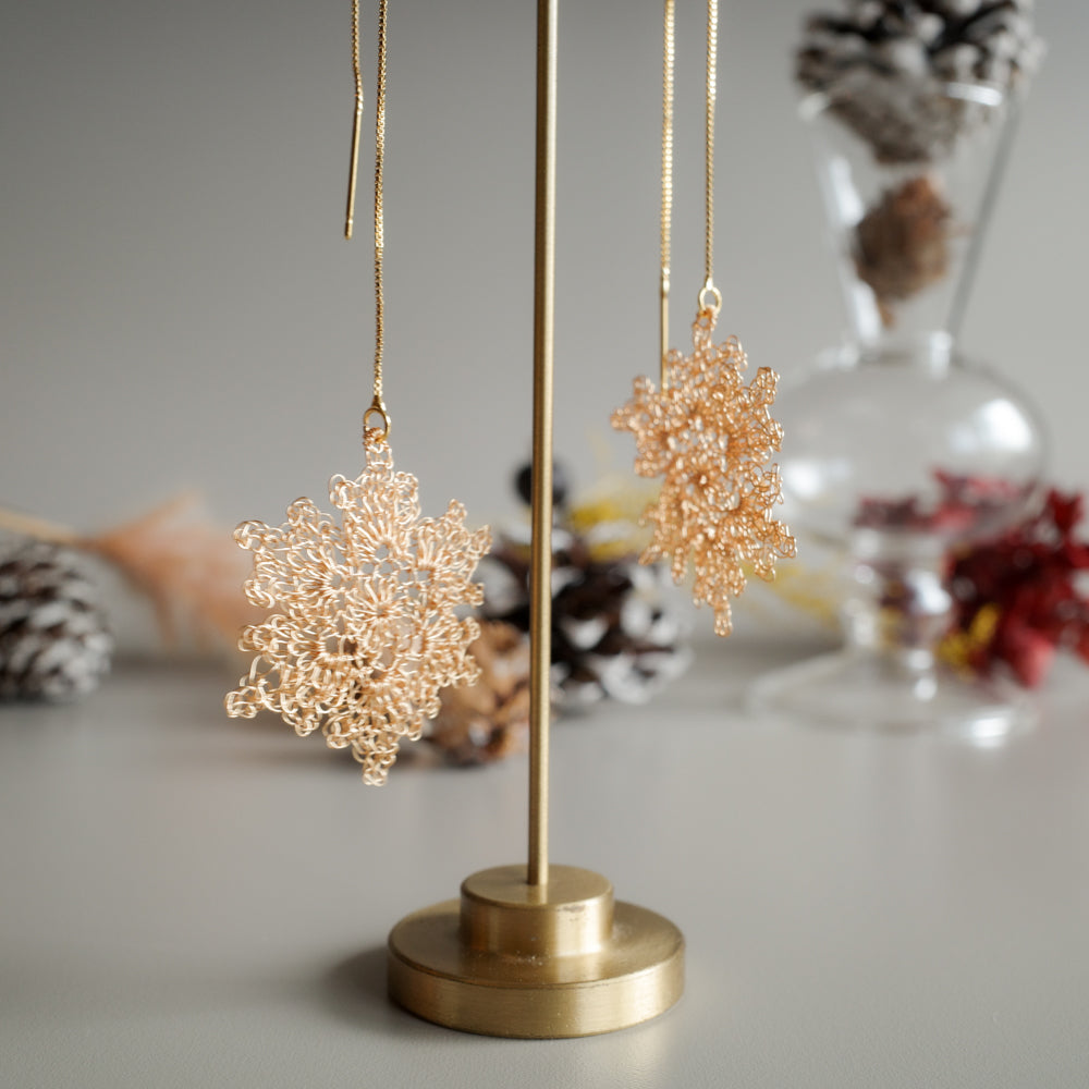 極細ワイヤーを丁寧に編み上げた雪の結晶モチーフが、耳元にやわらかな輝きを添えます。透け感のある編み地は驚くほど軽やか。長時間の装着でも負担になりにくく、日常から特別なシーンまで上品に寄り添います。