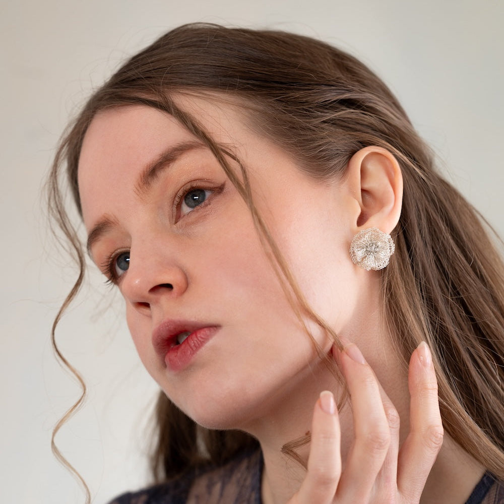 花びらのように繊細に編み上げたワイヤーレースを二重に重ね、立体感のあるデザインに仕立てた耳飾りです。