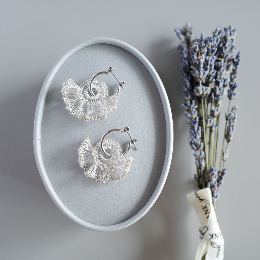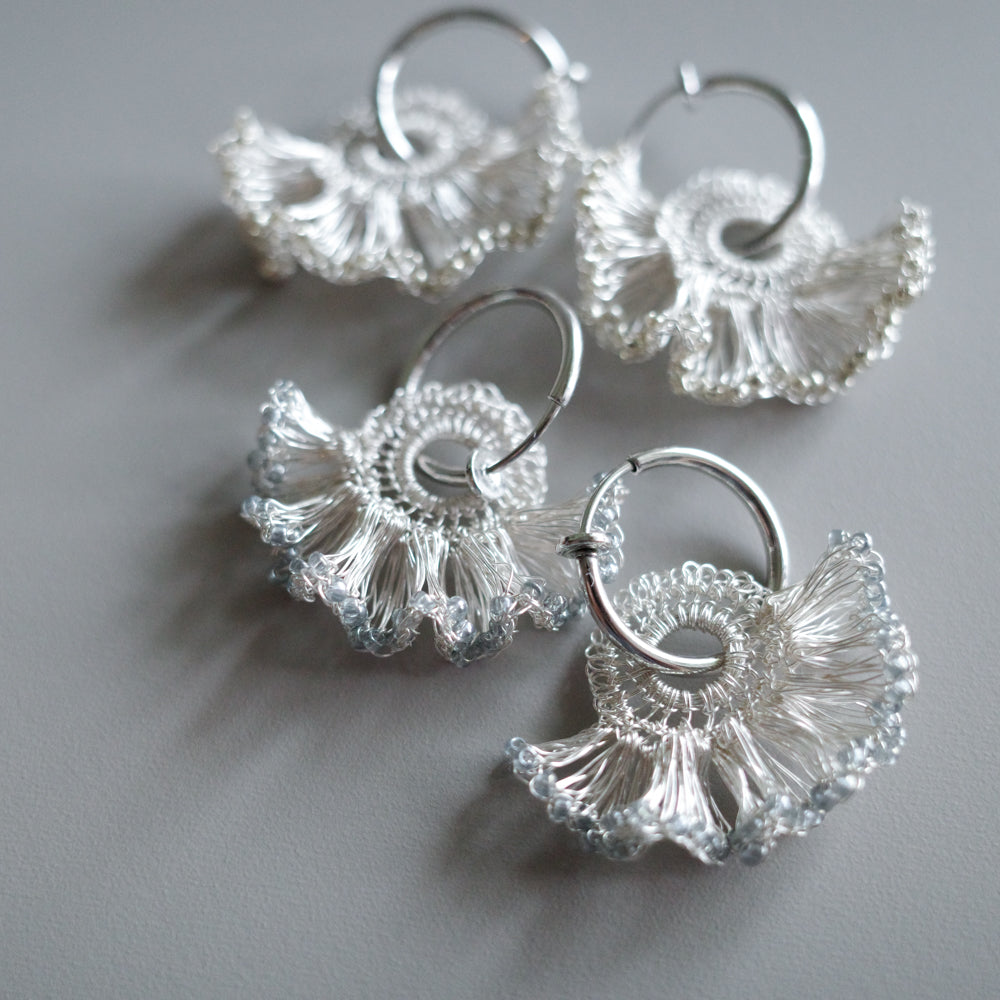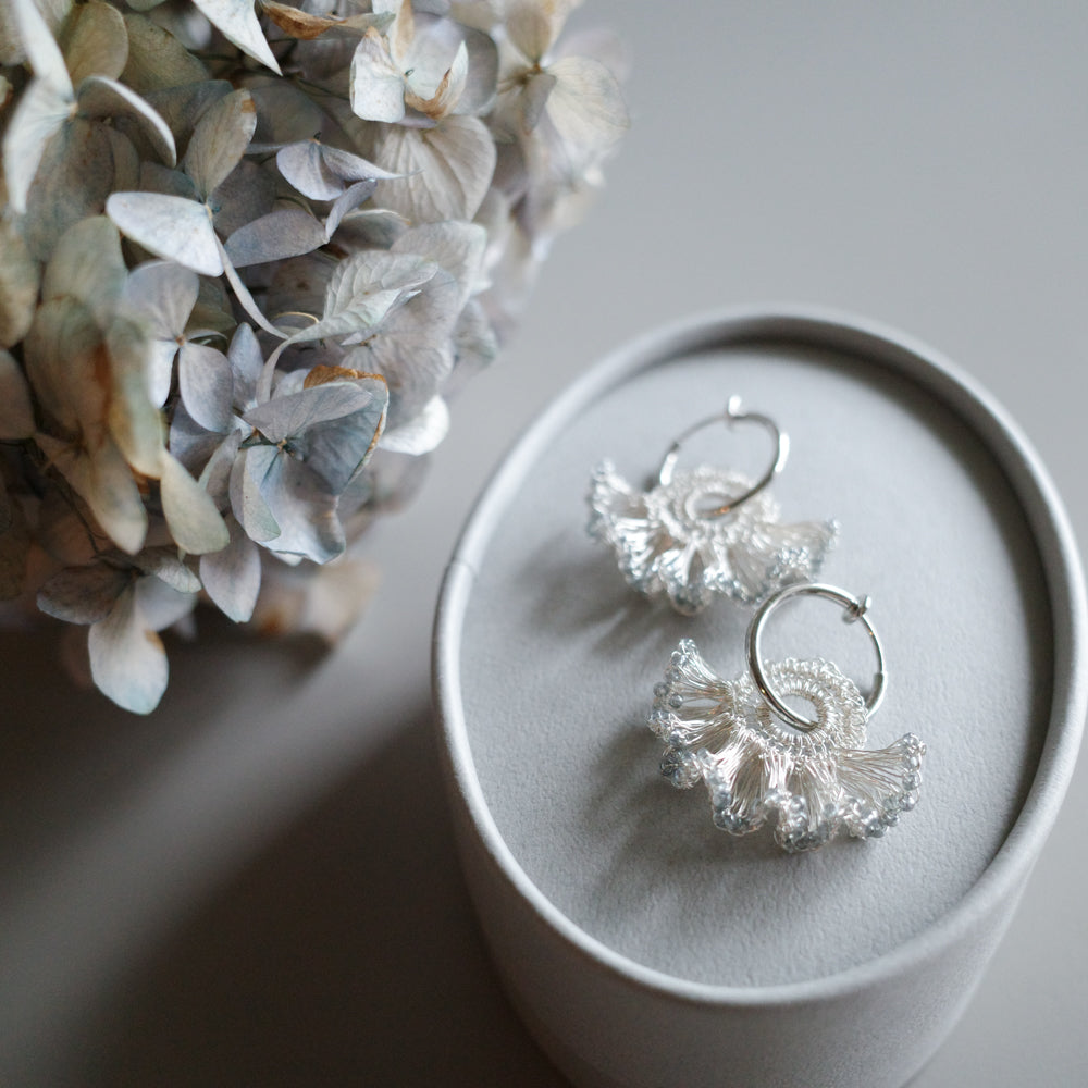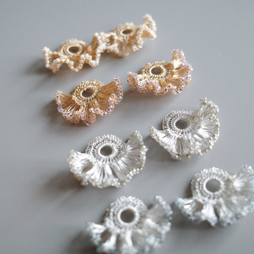 [ 關於金屬線鉤織 ] 以金屬線一針一針手工鉤織的精緻工藝。全程手作、配戴輕盈舒適,長時間也不易負擔,日常或正式場合都很適合。