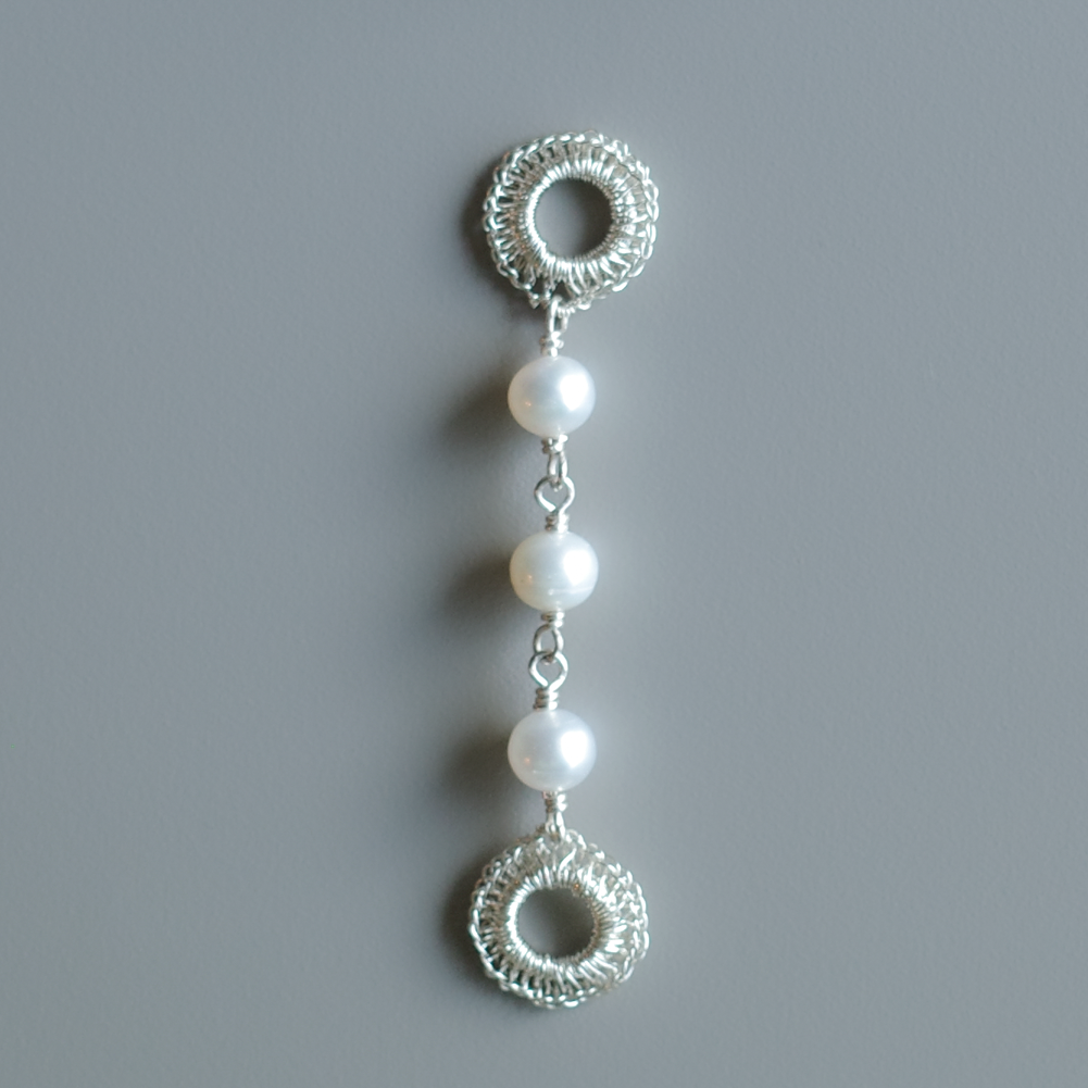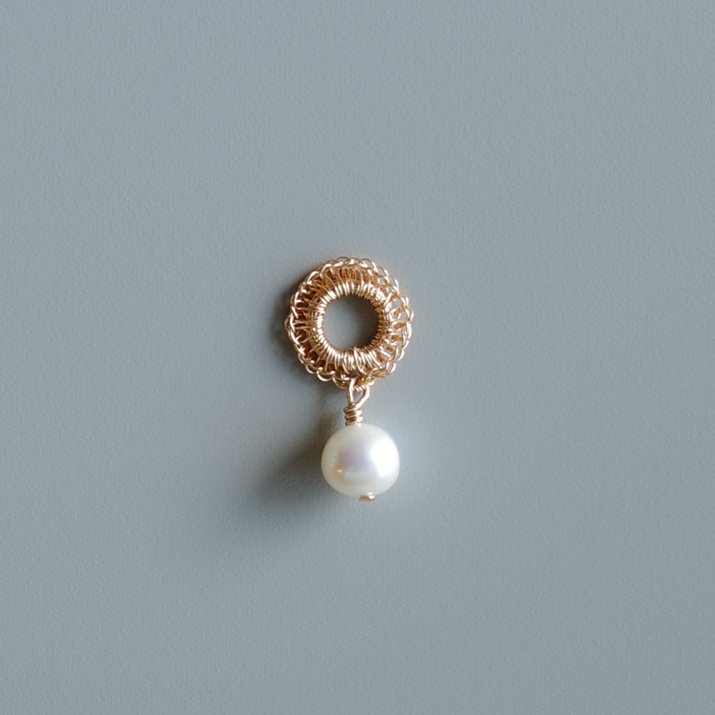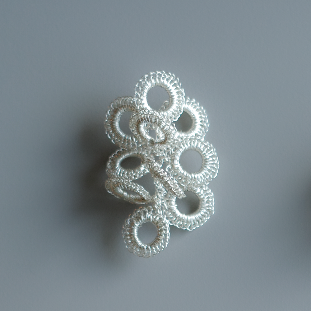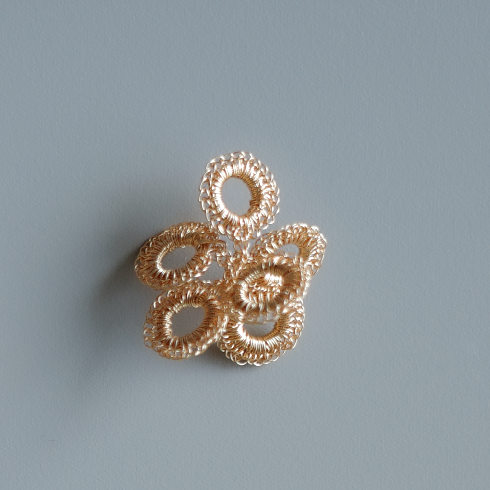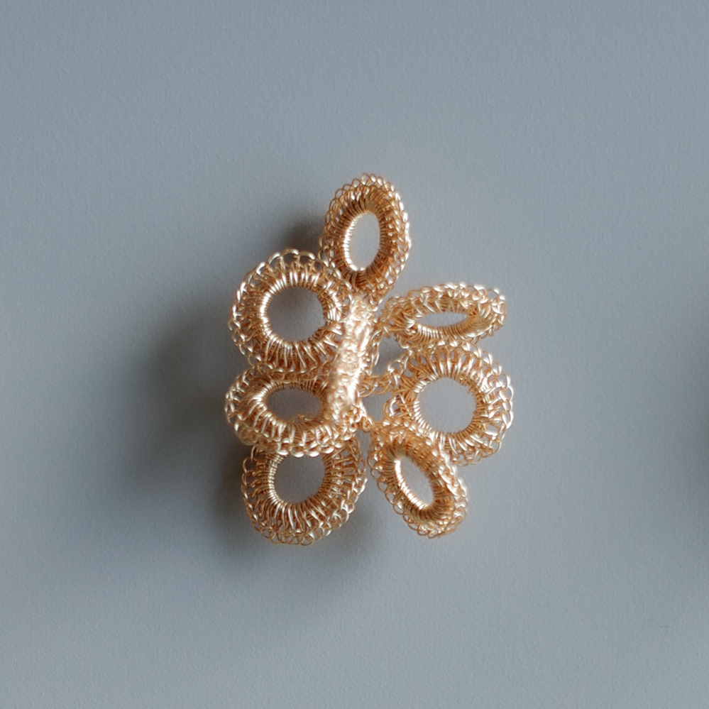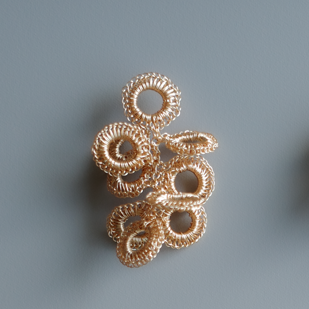 以極細金屬線一針一線手工編織而成的圓形造型, 會隨著角度與層疊方式呈現不同表情;金屬線特有的適度彈性,也讓造型更容易調整與搭配。