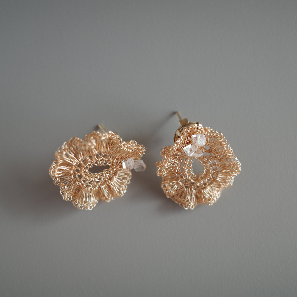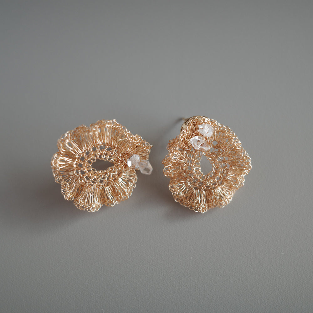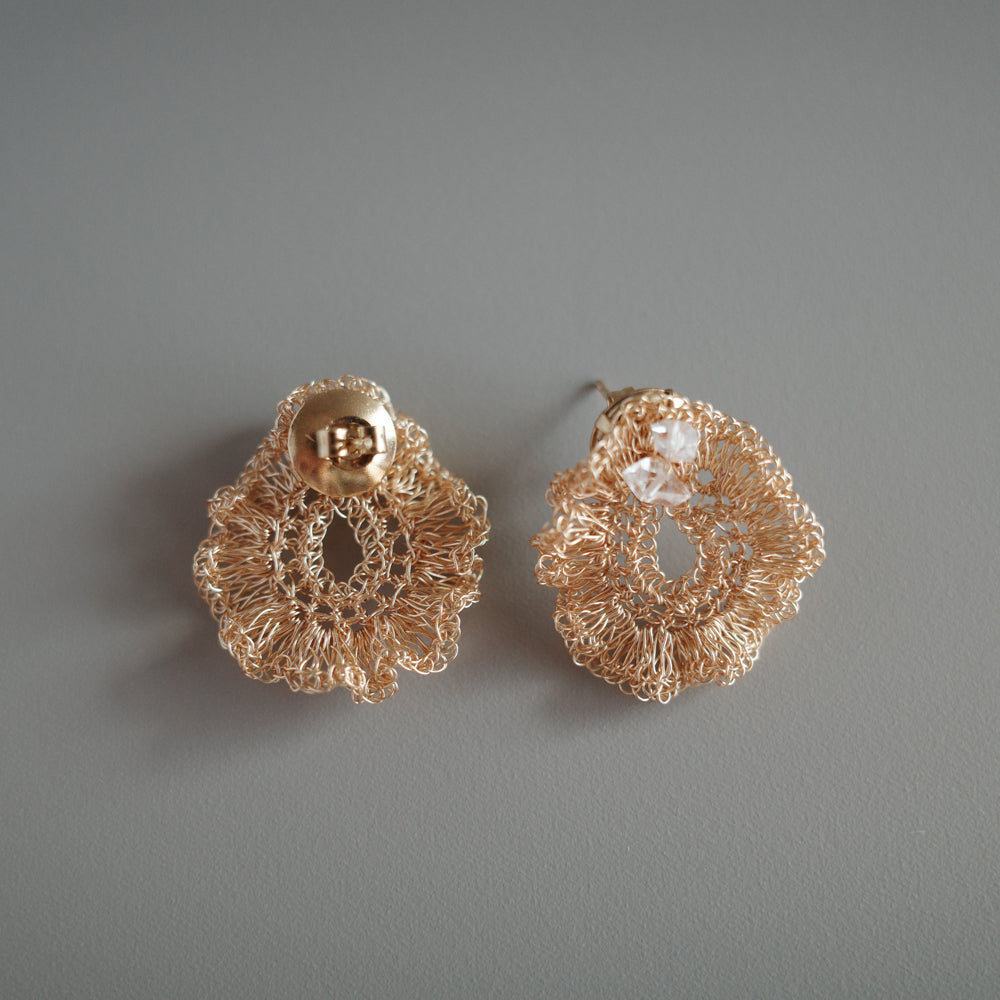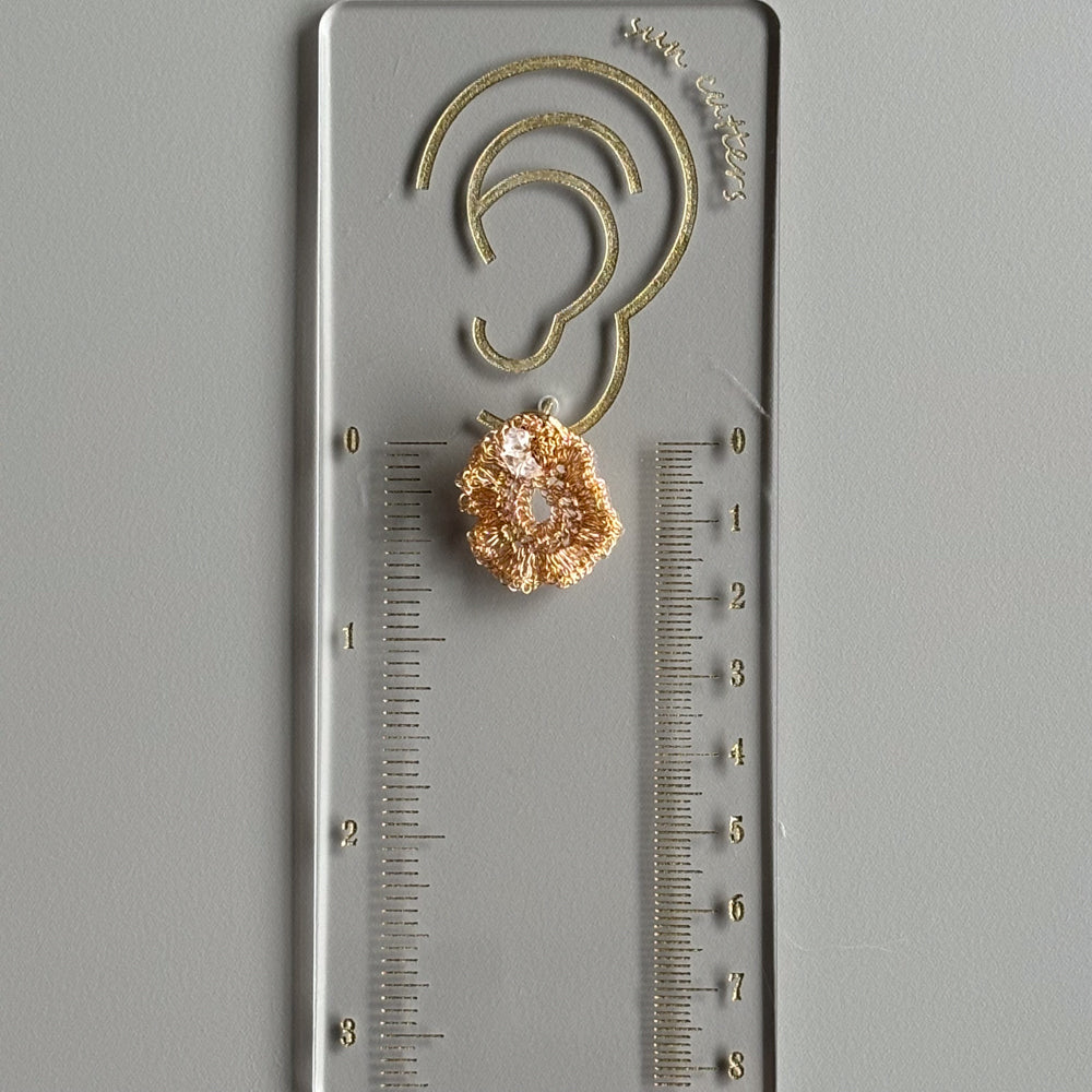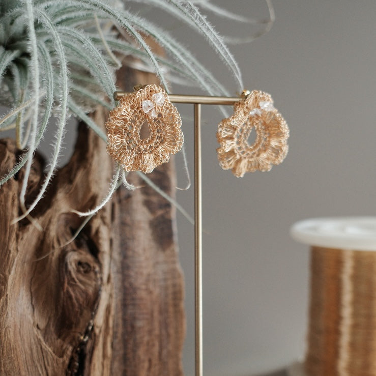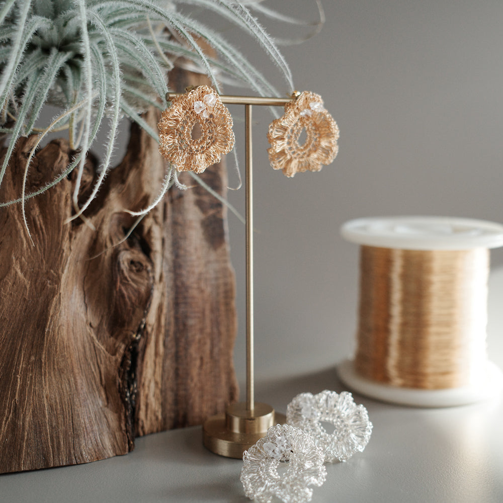 [ 關於金屬線鉤織 ] 以金屬線一針一針手工鉤織的精緻工藝。全程手作、配戴輕盈舒適,長時間也不易負擔,日常或正式場合都很適合。